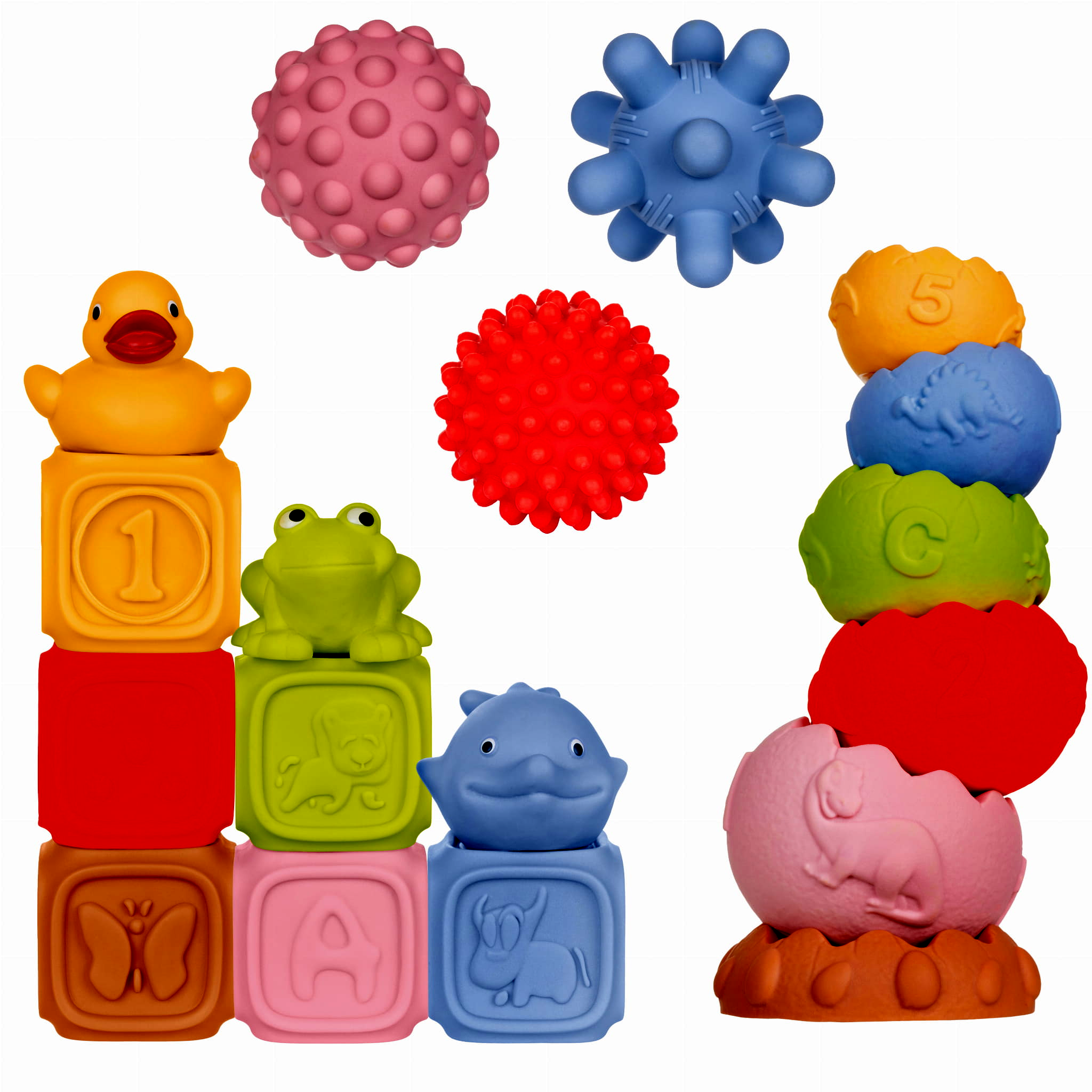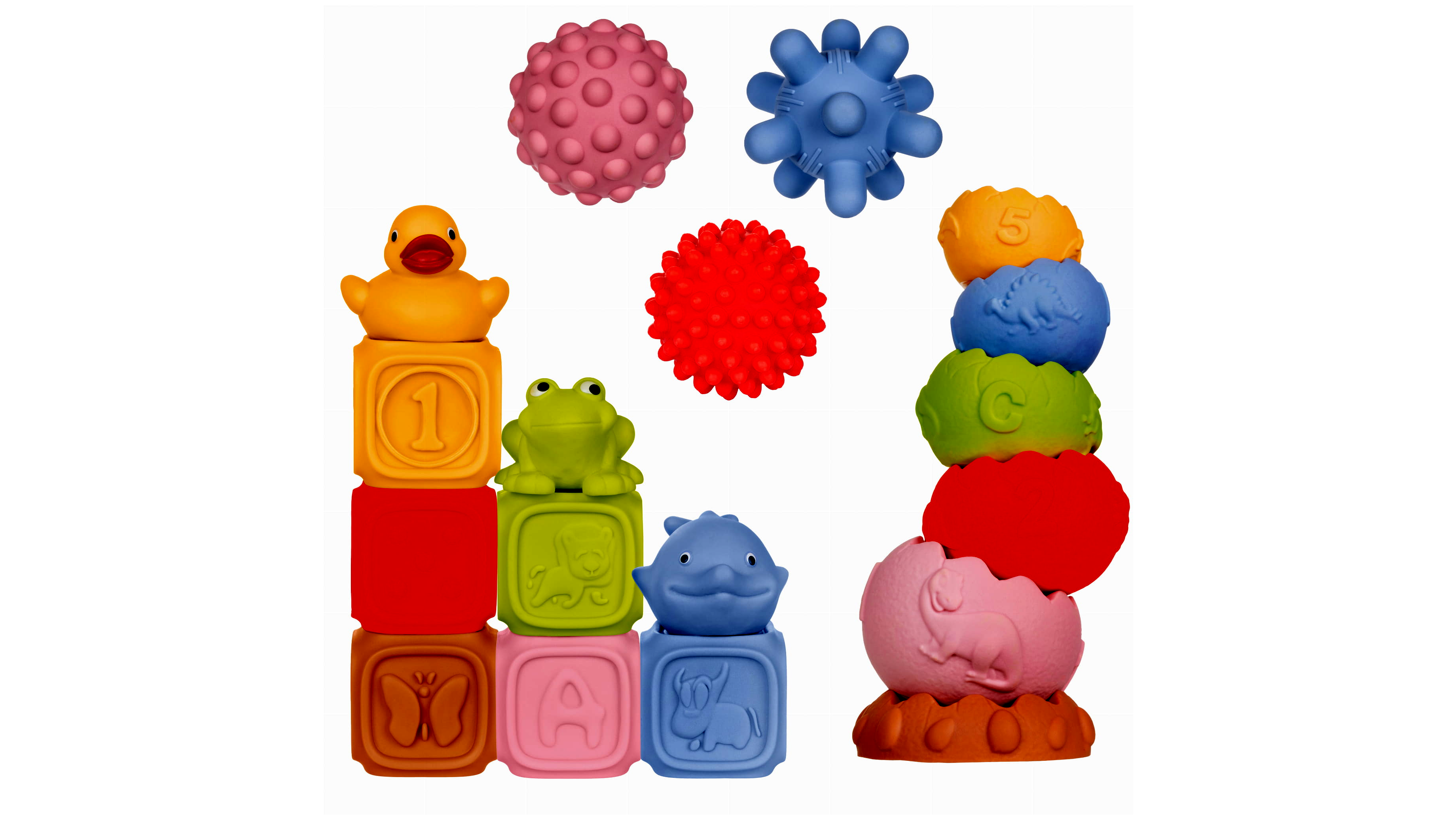 • Gazdag textúra- és formaélmény – különböző felületek, dudorok, minták (betűk, számok, állatmotívumok) fejlesztik a tapintást és a finommotorikát.