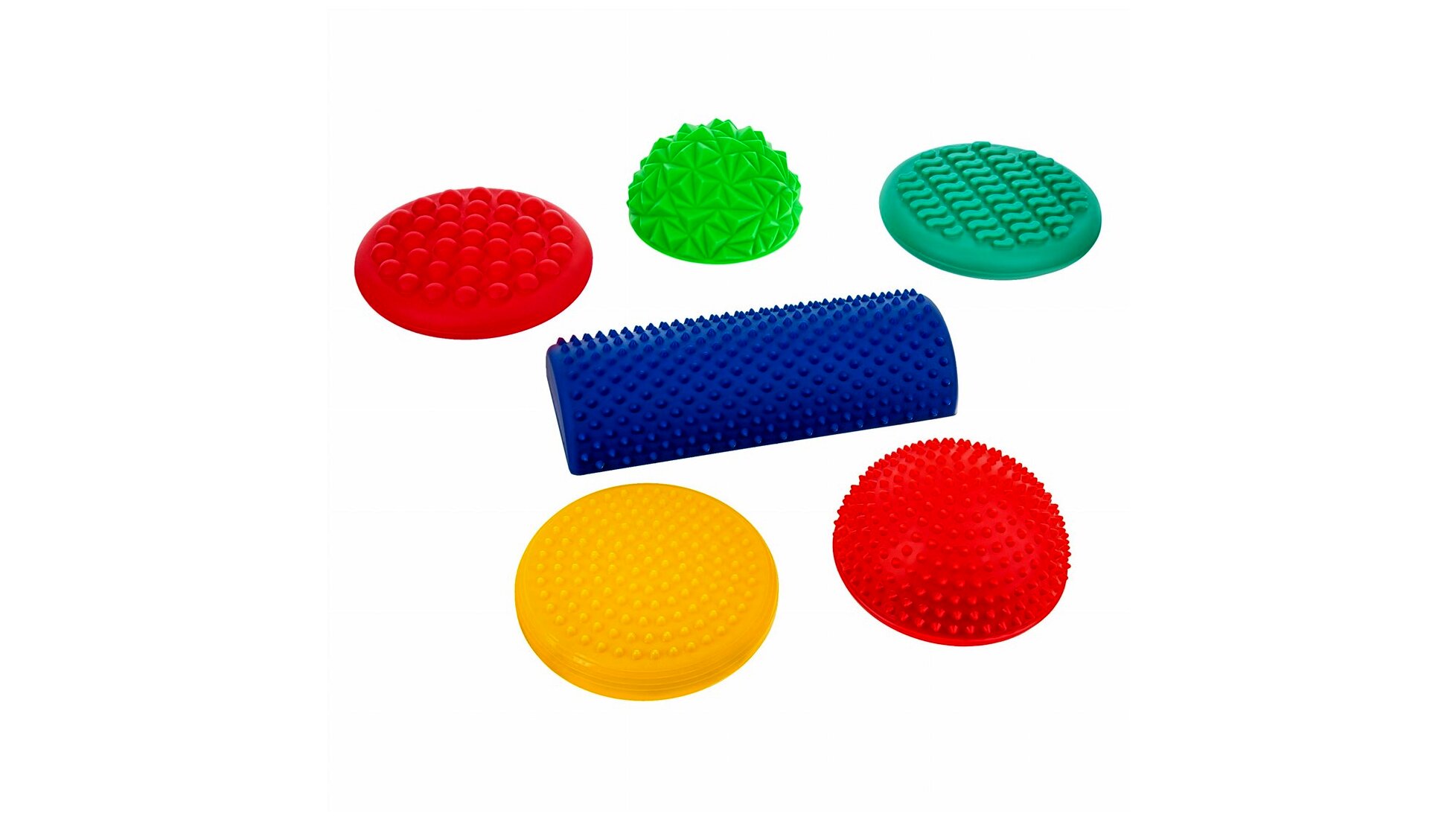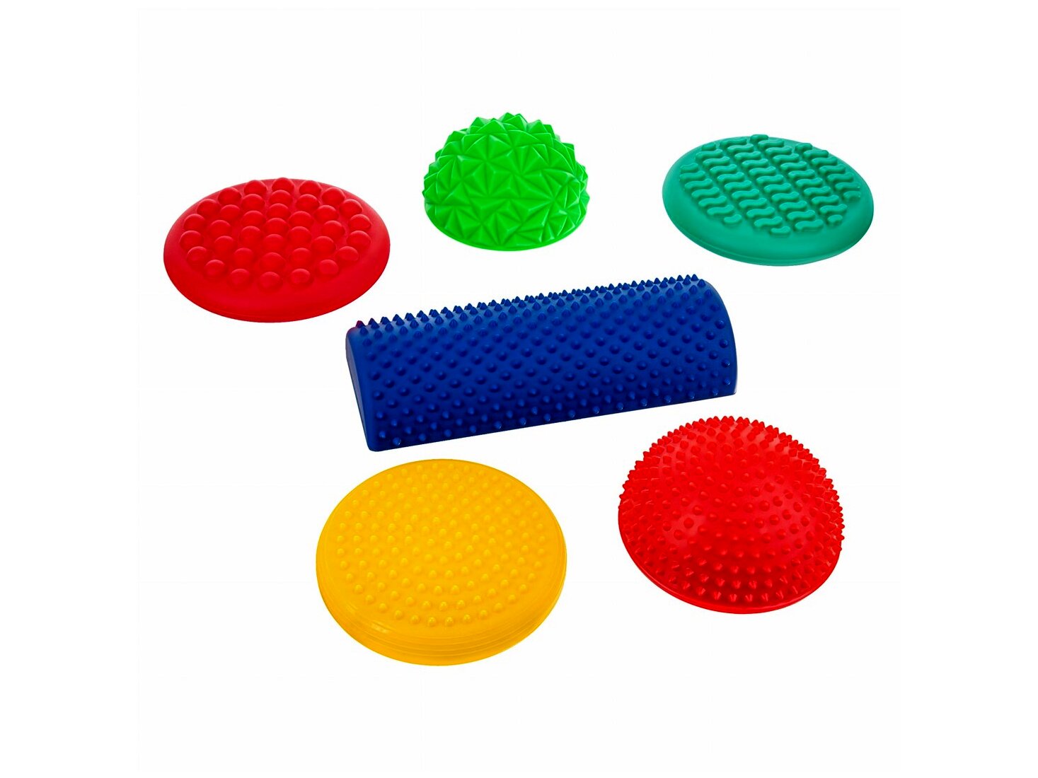 A különböző formájú elemek más-más tapintási élményt nyújtanak, így a gyermek változatos ingereket kap: a korongok stabil, lépegetésre alkalmas felületet adnak, míg a félgömbök játékos egyensúlyozásra, gurításra és lábbal/talppal való felfedezésre ösztönöznek.