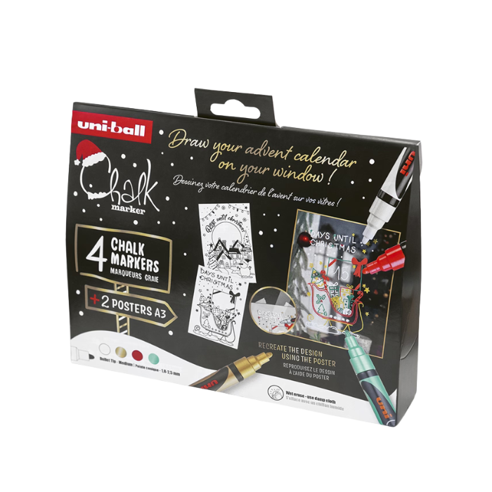 Az Uni folyékony kréta készlet különleges karácsonyi hangulatot varázsol otthonába. A készletben található 2 db A3-as papír sablon segítségével gyerekjáték az ablakdekoráció elkészítése. Csak húzza fel a kréta színét a sablonon keresztül, és máris kész a minta! Remekül mutat üvegen, de papírban és kartonban is kreatívan felhasználható.