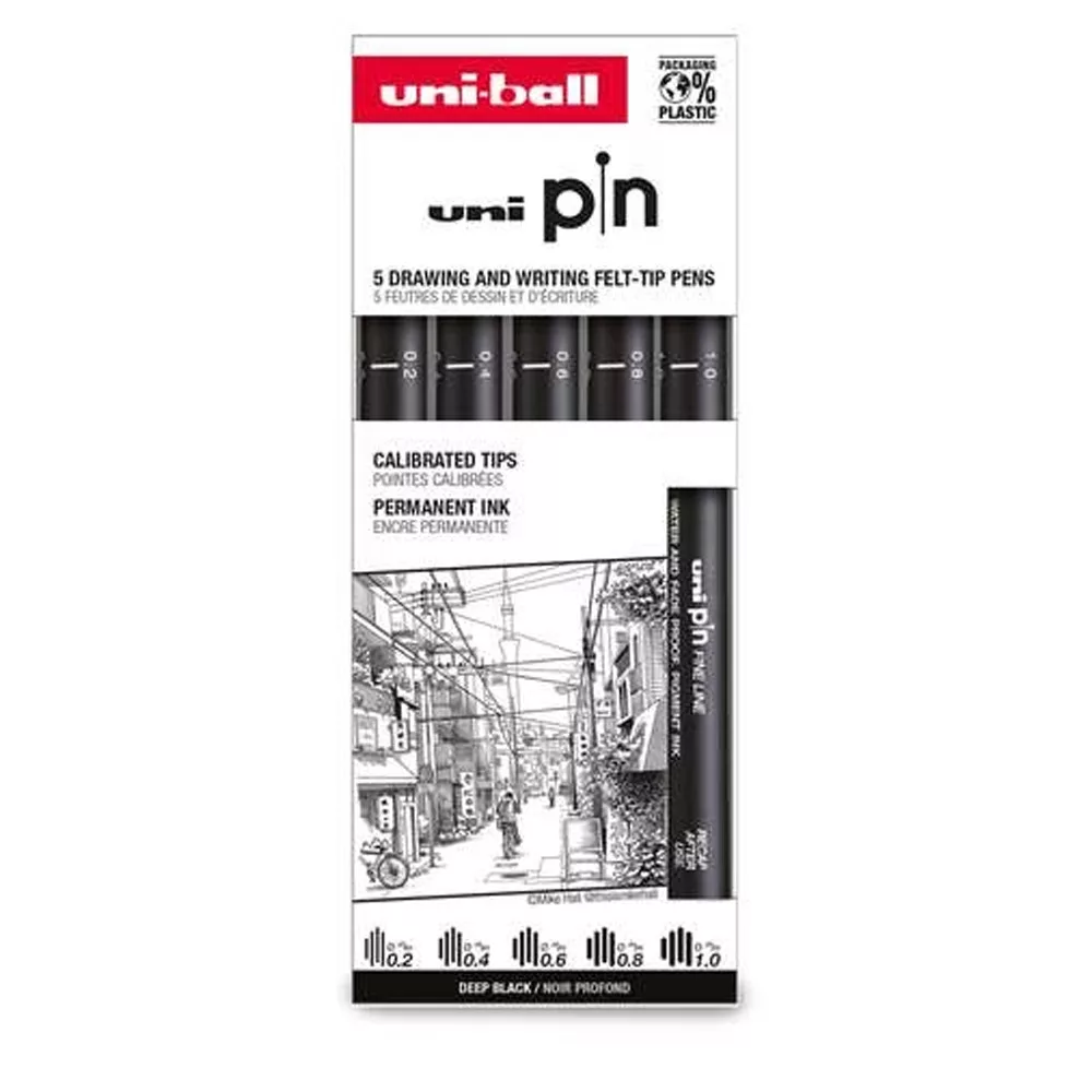 Az Uni Pin rajzmarkerek különleges kialakítása lehetővé teszi, hogy éles és tiszta vonalakat, valamint különböző technikákat alkalmazz, mint például a pontozott árnyékolás, a keresztsraffozás és az árnyékolás. A tömör pigment tintavonal könnyen használható akvarellel együtt, mivel a tinta nedves állapotban sem kenődik el.