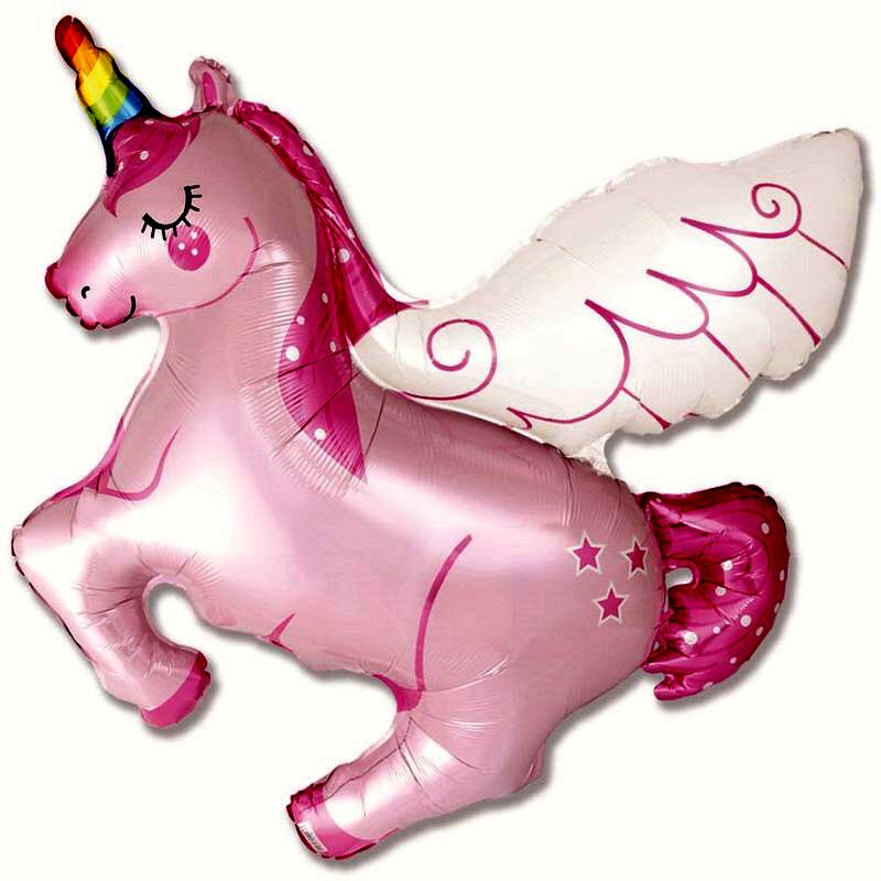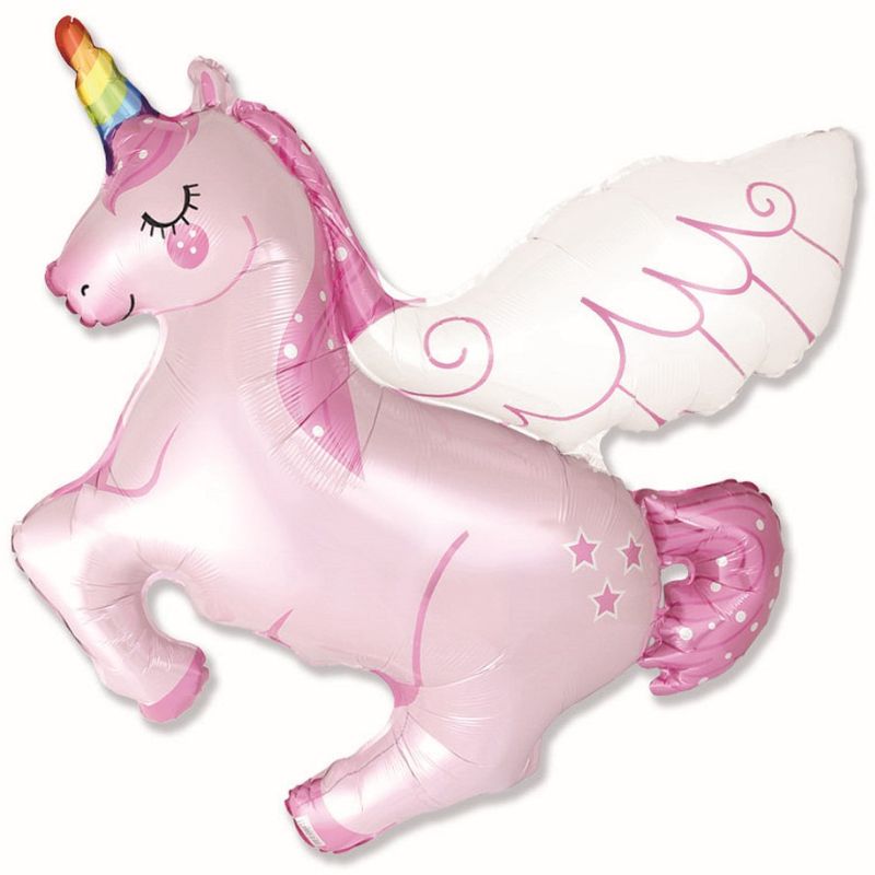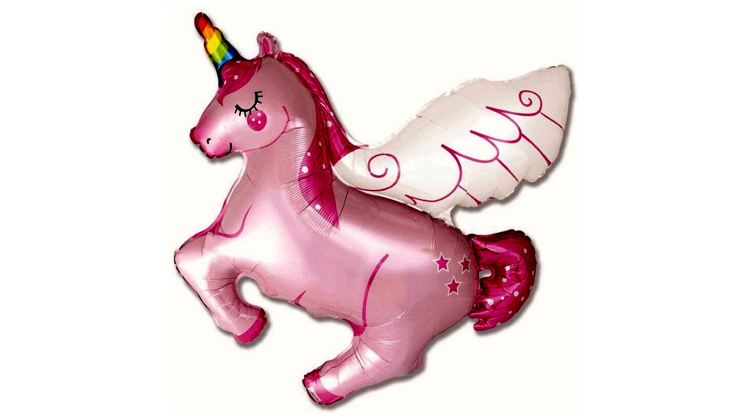 Óriási, pink színű, unikornis formájú fólia lufi szivárványszínű szarvval és szárnyakkal.