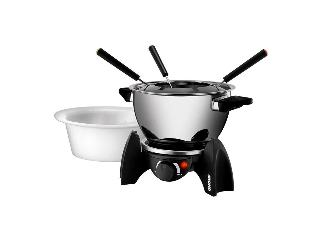 Az Unold 48615 Fondue akár hat személy számára készült, és kulináris változatosságot tesz az asztalra! A rozsdamentes acélból készült fondue edény ideális a klasszikus húsfondue-hoz vagy az ázsiai változatokhoz a húslevesben ízletesen megfőzött halakkal, garnélarákkal vagy zöldségekkel. A készlet tartalmaz egy tűzálló kerámiaedényt is a csokoládéfondühöz, amelyben a friss gyümölcsök csodálatos mázat kapnak az olvasztott csokoládéval. Vagy szintén nem húsos és kiadós, sós sajtfondüvel. A fondue szetthez tartozó hat fondüvilla számára rozsdamentes acélból készült, villatartóval ellátott fröccsenésgátlót biztosítunk.