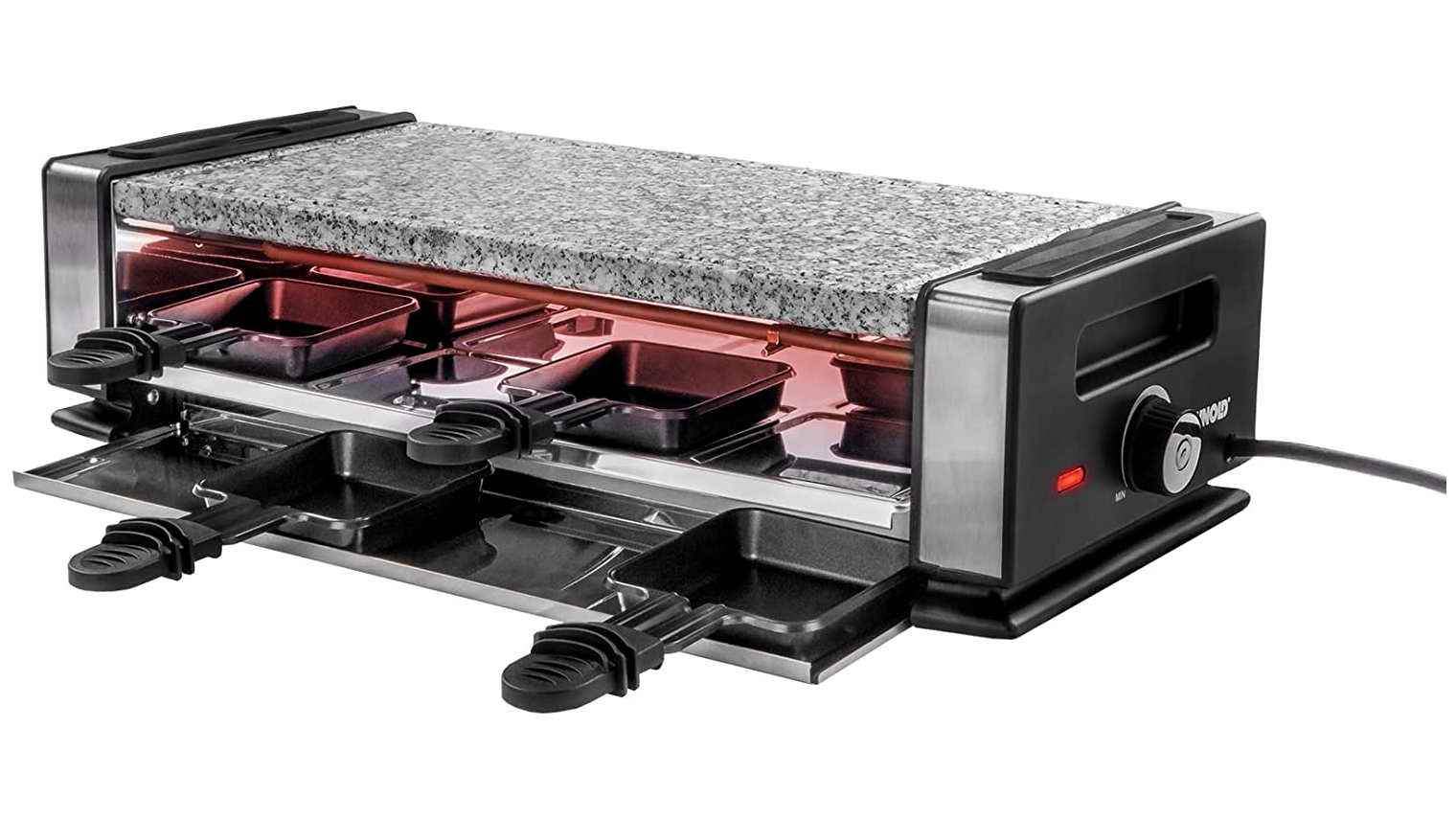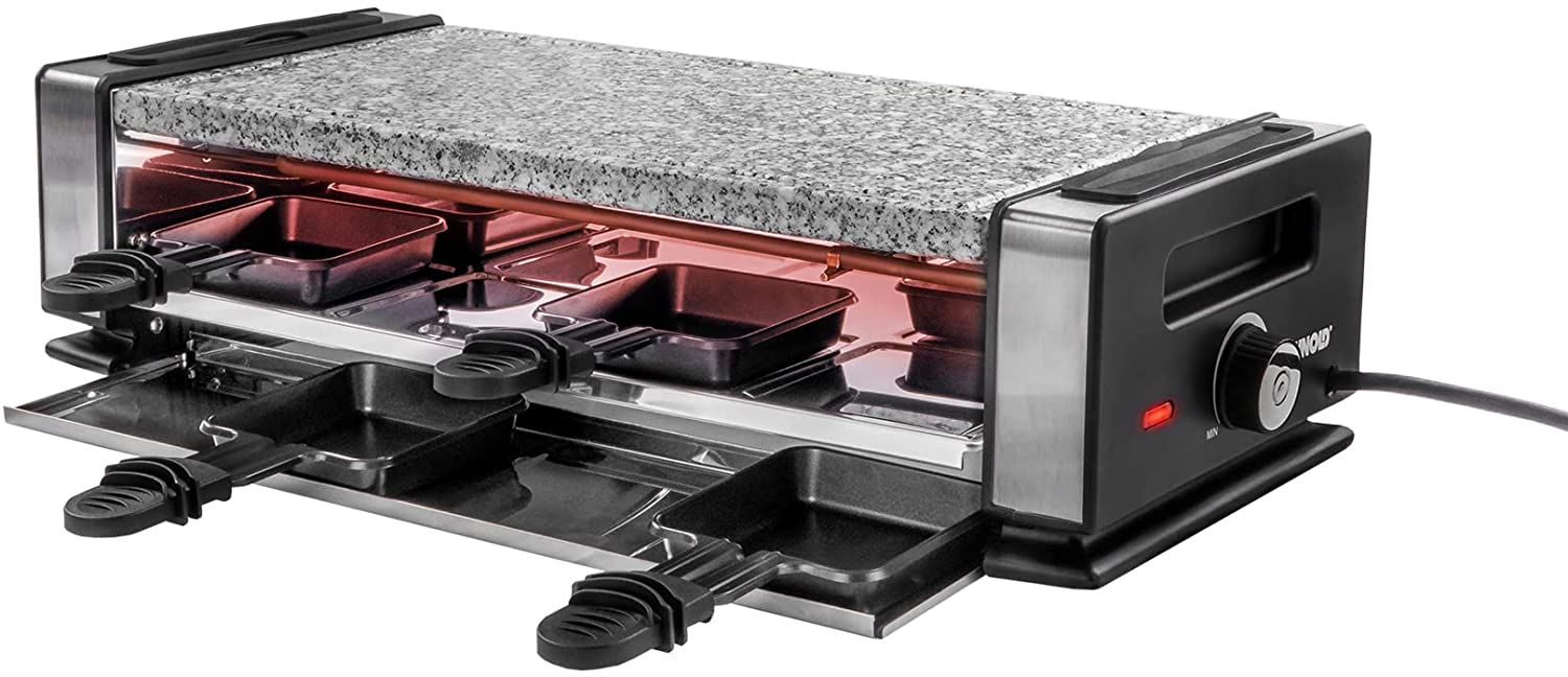 A Raclette Delice Basic kulináris változatosságot hoz az asztalra akár 8 fő számára. Ugyanis a 8 db tapadásmentes bevonatú serpenyő és 8 db műanyag spatula mellett 2 db grilllap is található a felszerelésben: egy természetes kőből és egy megfordítható öntött alumíniumból, sima vagy bordázott felülettel.