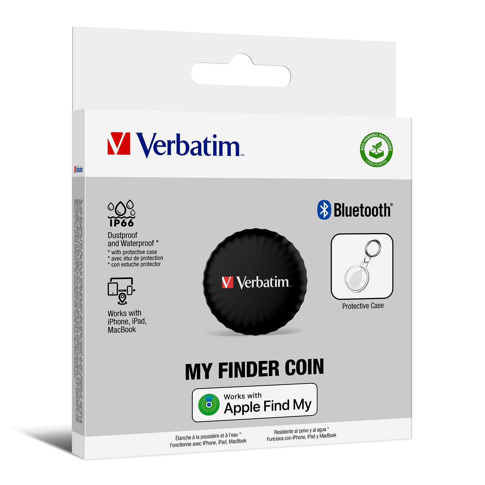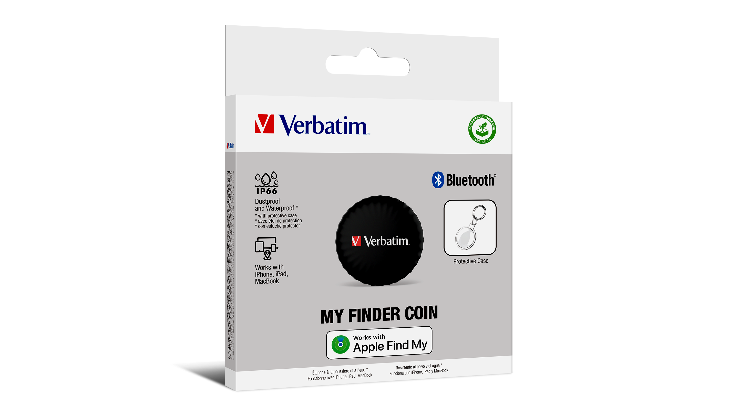 Könnyedén tartsa nyilván értékeit a Verbatim My Finder Bluetooth nyomkövetőjével, amely az Apple Find My alkalmazással működik. Ez a készülék tökéletes választás kulcsok, táskák vagy egyéb értékek nyomon követésére. Csak helyezze a nyomkövetőt a követni kívánt tárgyra, és az iPhone, iPad vagy MacBook segítségével a Find My Appon keresztül bármikor megkeresheti azt.