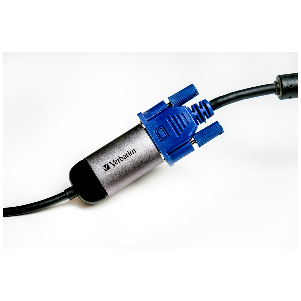 A Verbatim USB-C ™ - VGA adapter lehetővé teszi az USB-C vagy Thunderbolt 3 (USB-C) kompatibilis laptopok és MacBookok csatlakoztatását egy VGA kijelzőhöz. Ideális társ a legújabb vékony laptopokhoz és a korlátozott portokkal rendelkező MacBookokhoz. A laptop frissítésekor nem kell kicserélnie a teljes beállítást, egyszerűen csatlakoztassa az adaptert a laptop USB-C portjához, majd csatlakoztassa a TV, a projektor vagy a monitor VGA csatlakozóját.