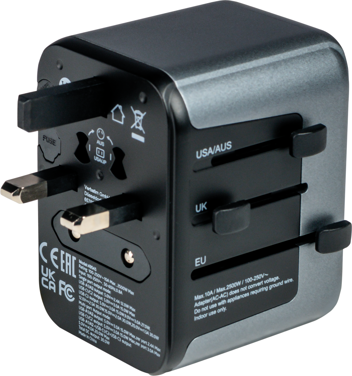 A Verbatim univerzális utazási adapter több mint 180 országban használható - vigye magával mindenhová, és soha ne maradjon áram nélkül. Ez a világról világra multifunkciós csatlakozó lehetővé teszi, hogy a világ bármelyik helyi áramforrásához csatlakozhasson, és feltölthesse áramra éhes eszközeit, például laptopjait és fényképezőgépének akkumulátorait. Az alján található USB-C és USB-A portok segítségével minden USB-s eszközt tölthetsz, beleértve az okostelefonokat, Bluetooth hangszórókat, táblagépeket, power bankokat és Kindle-eket.