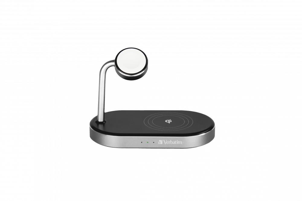A Verbatim 3 az 1-ben töltőállomással egyszerre töltheti fel az összes eszközét.Vezeték nélkül töltheti az Apple Watch-ot, az iPhone-t (8 vagy újabb) vagy más Qi tanúsítvánnyal rendelkező vezeték nélküli töltésre alkalmas eszközt, valamint egy harmadik eszközt kábelen keresztül a Quick Charge 3.0 USB-A porton keresztül.