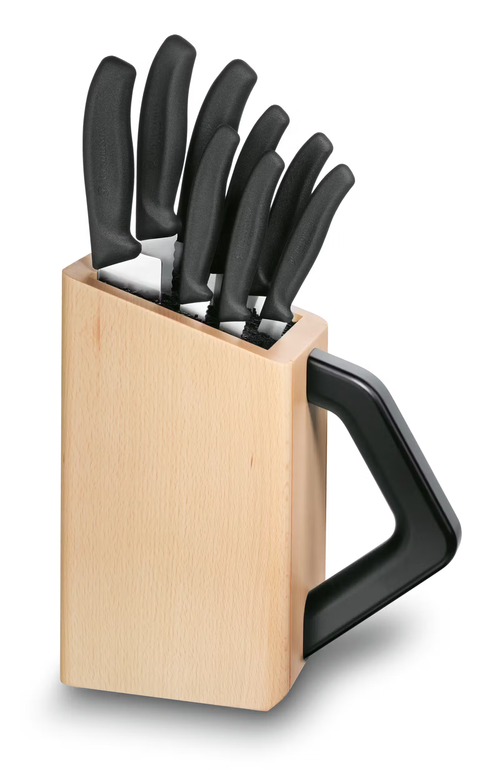 Ez a 8 részes, elegáns késblokk készlet azoknak készült, akik szeretik a pontos, biztonságos és kényelmes munkát a konyhában. A gondosan összeválogatott, mindennapi használatra tervezett kések és a masszív fa blokk egy komplett, áttekinthető és mindig kéznél lévő eszközkészletet adnak a főzés szerelmeseinek.