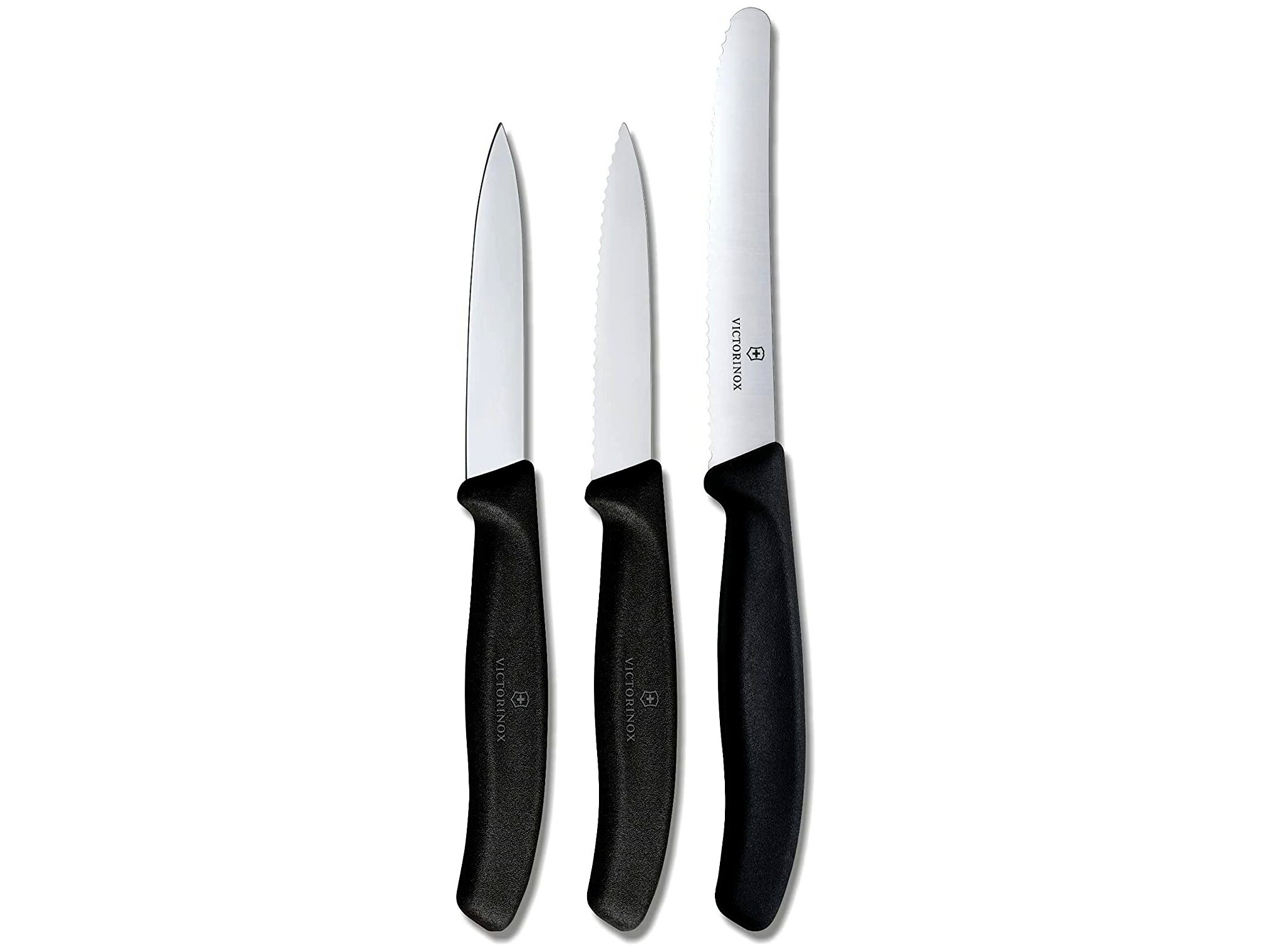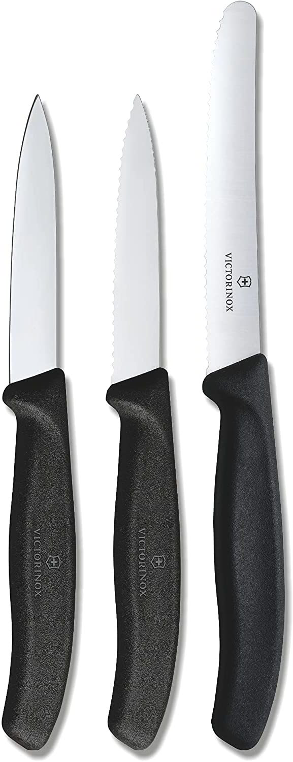 Minden konyhában van egy zöldségkés. Akkor miért nem szerez be hármat közülük? Zöldség kés késkészletünk ideális eszköz vágásra, hámozásra.. Az átgondolt készlet két fogazott kést tartalmaz gyümölcs számára, és egy egyenes vágású kést a kisebb citrusfélékhez és zöld zöldségekhez.