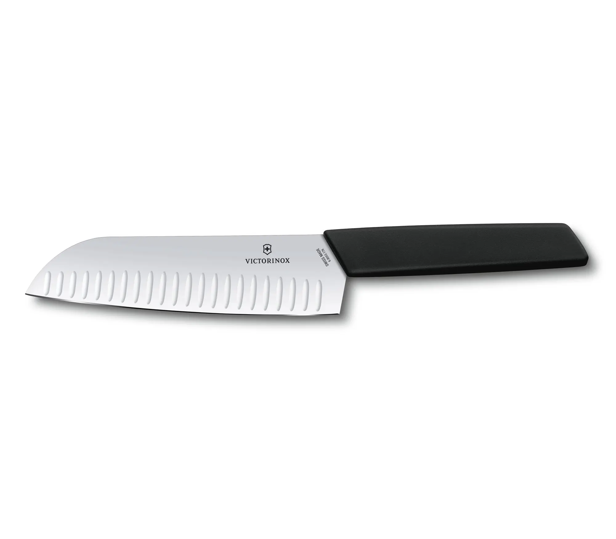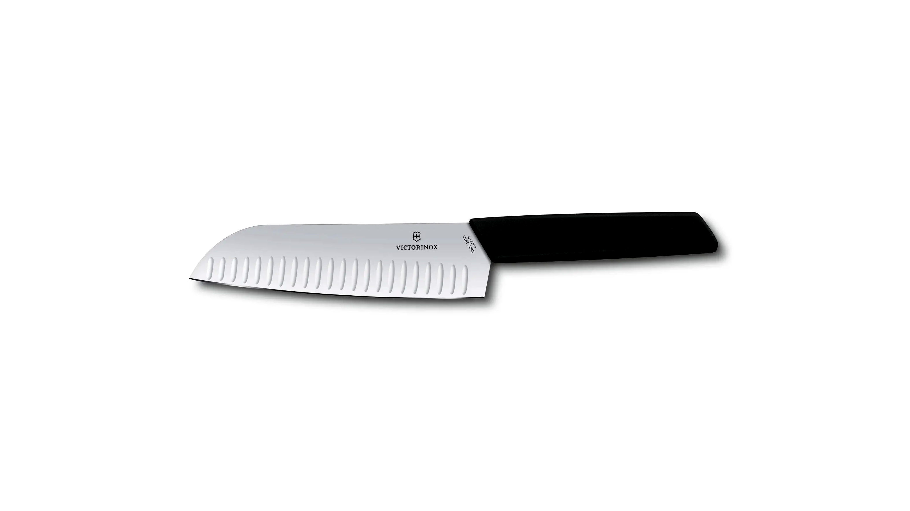 A Victorinox Swiss Modern Santoku kés a japán mesterszakácsok által kedvelt dizájnt és a svájci Victorinox precíziós technológiáját ötvözi. "Santoku" szó szerint "a három erény kése", amely kifejezés tökéletesen jellemzi a kés sokoldalúságát. Legyen szó hús szeleteléséről, gyümölcs darabolásáról vagy zöldség aprításáról, ez a 17 cm-es pengével rendelkező kés minden feladatot könnyedén és hatékonyan végez.