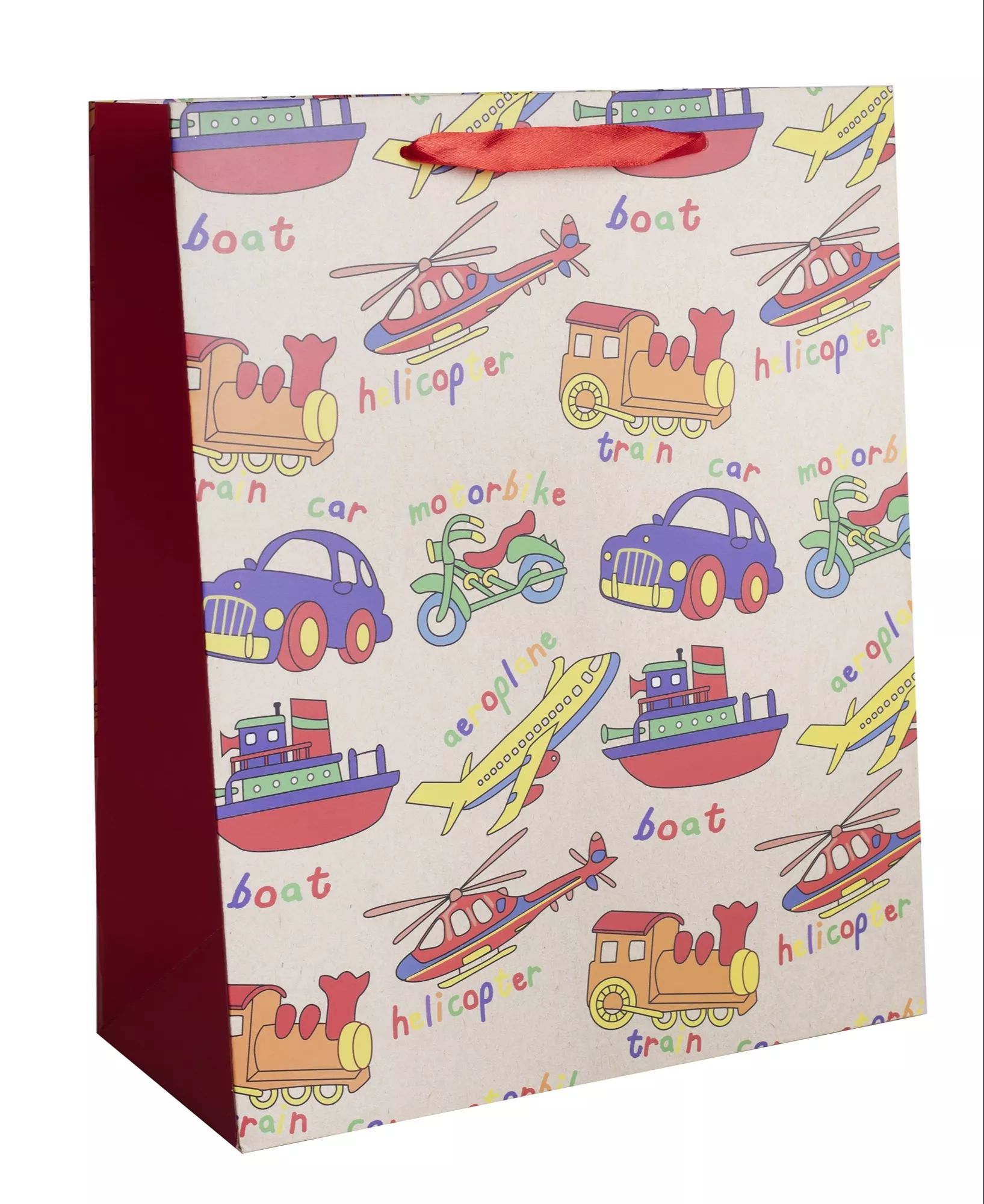 Ez a színes, járműveket ábrázoló ajándékzacskó tökéletes választás, hogy az ünnepi ajándék átadása még különlegesebb és vidámabb élmény legyen. A szalagfüllel ellátott táska kényelmes hordozást biztosít, és kiváló alternatíva a hagyományos csomagolópapírral szemben.