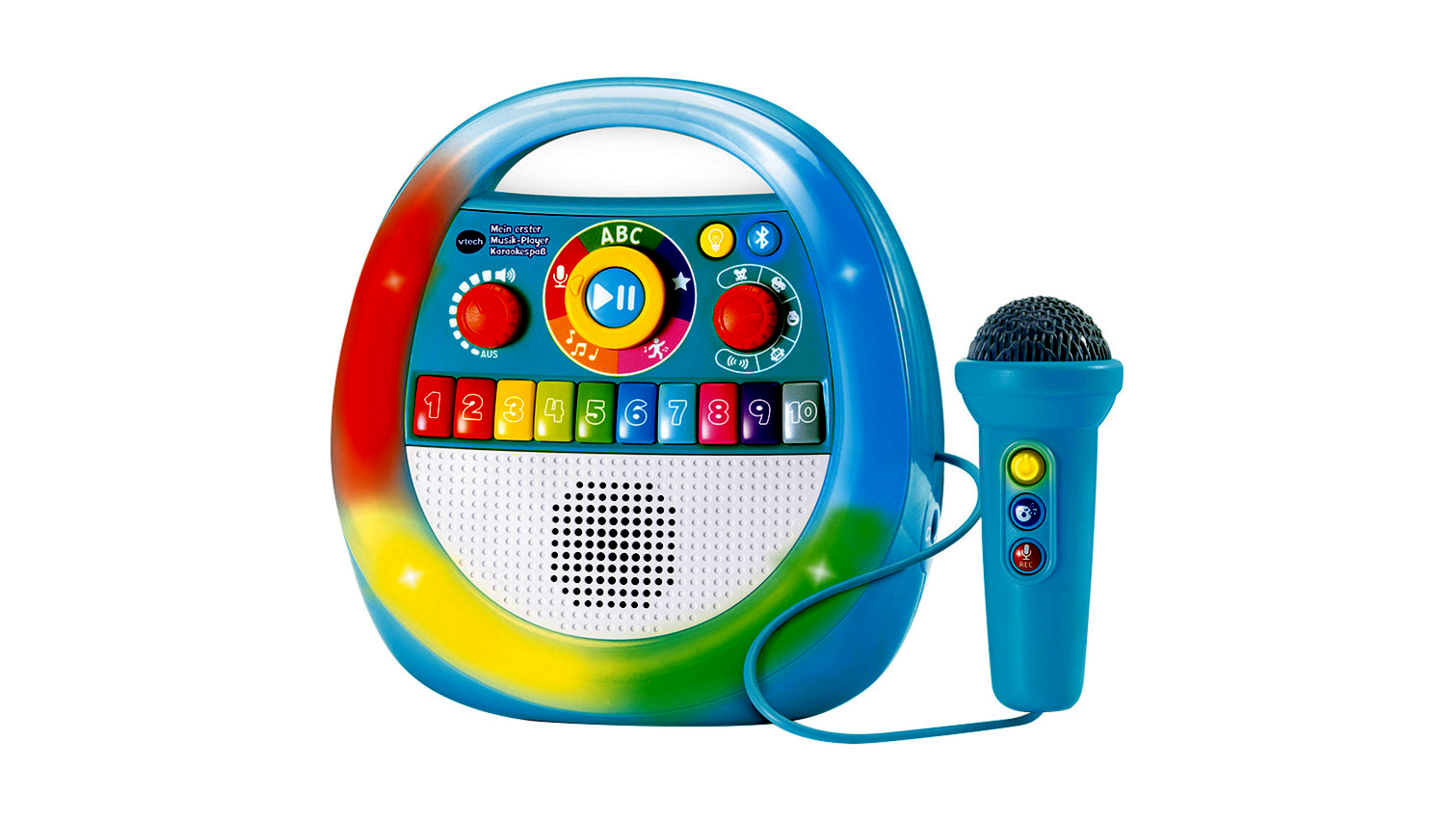 Ez a zenélő karaoke játék nemcsak önállóan használható, hanem Bluetooth kapcsolat segítségével további zenék is lejátszhatók rajta, így akár kedvenc gyerekdalok vagy mesék is megszólaltathatók. A 3,5 mm-es vonalbemenet révén más eszközök is csatlakoztathatók. A beépített telefontartó még több lehetőséget ad a közös énekléshez, videók nézéséhez, mindezt egy gyerekbarát, masszív műanyag házban.