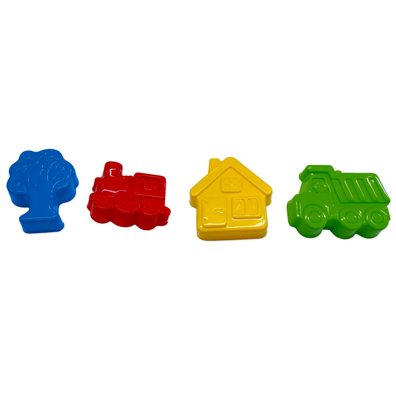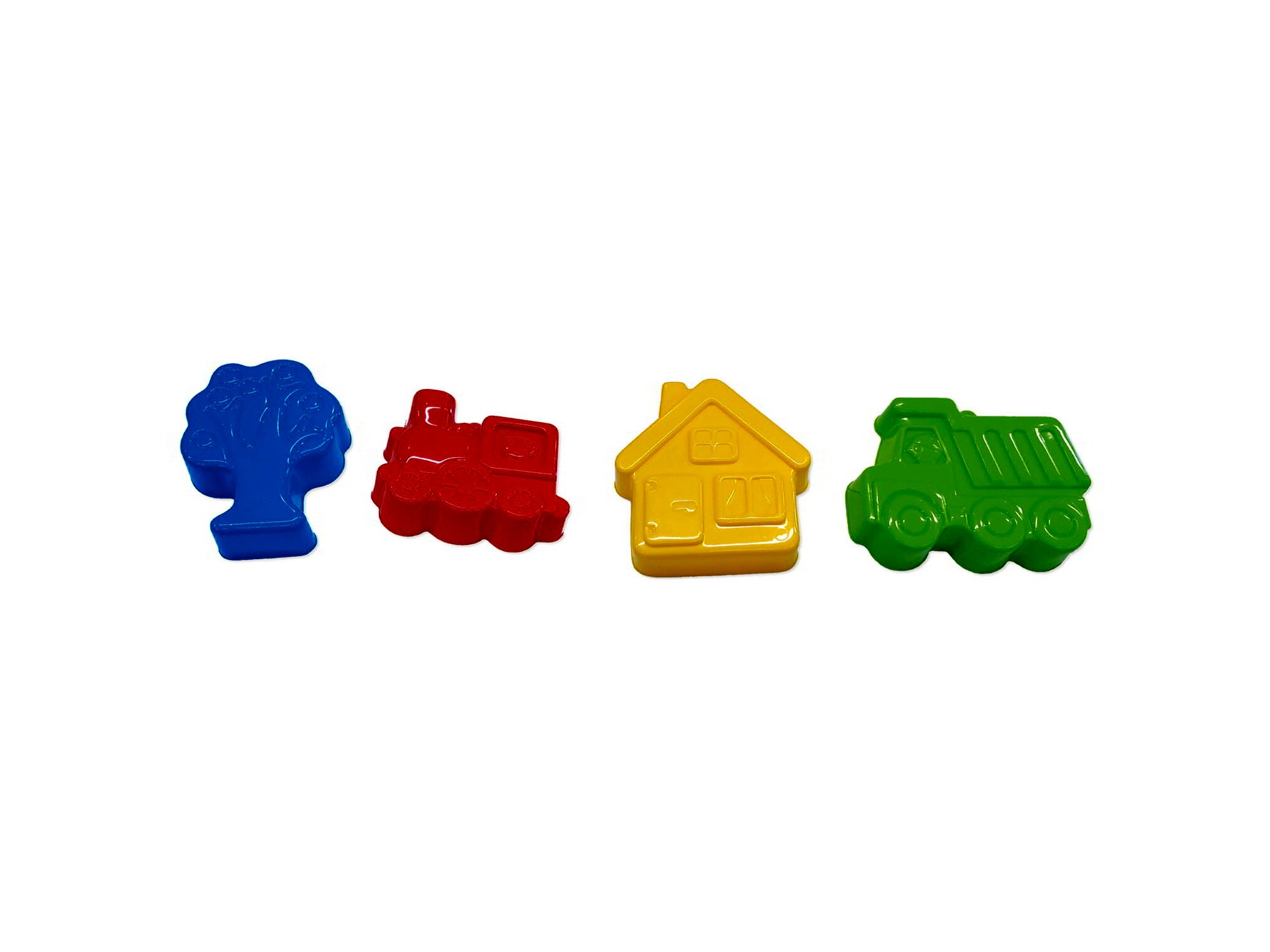 - 4 különböző színes forma (16,8 cm) mozdonyok, dömper, ház és fa forma