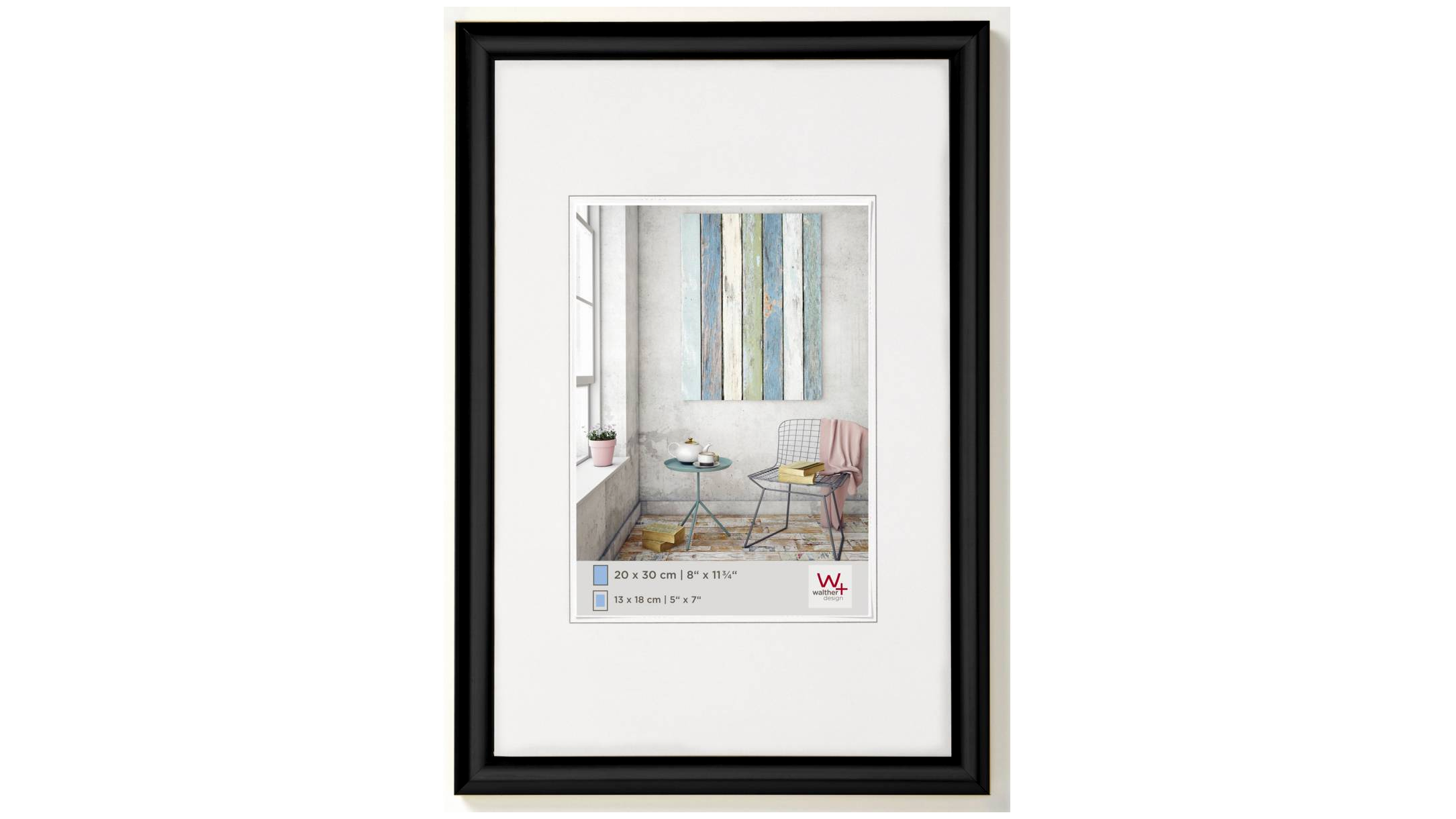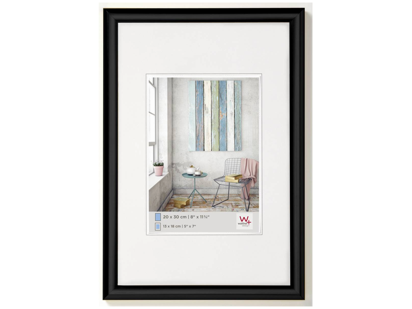A Walther műanyag keret, profilozott léccel. 40x50 cm-es képek tárolására alkalmas képkeret. Hátlapja kartonpapír. Falra akasztható fekete színű keret.