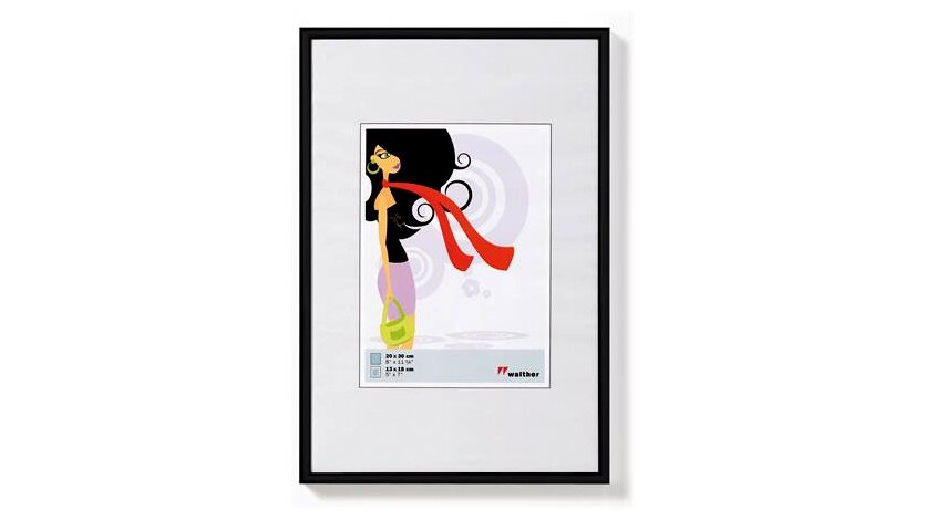 vékony, gömbölyű léccel fémes hatású festéssel közepén perforációval, melyet kiemelve a megmaradt rész paszpartuként használható hátlapja farostlemez, kitámasztóval fektethető és állítható, valamint akasztható elhelyezéssel fekete színben