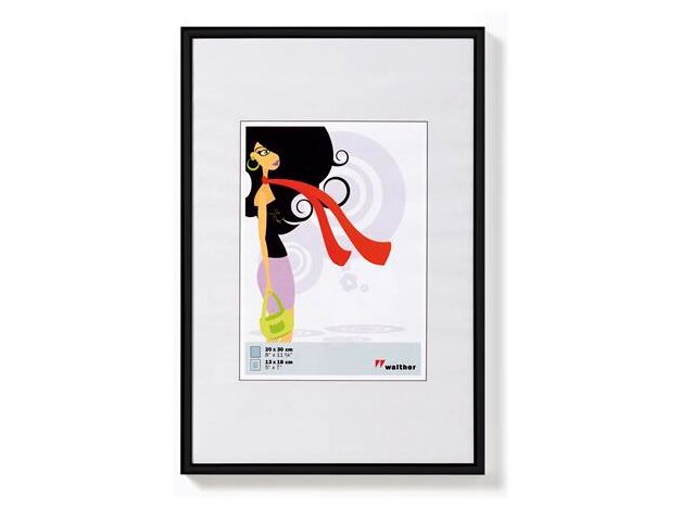 vékony, gömbölyű léccel fémes hatású festéssel közepén perforációval, melyet kiemelve a megmaradt rész paszpartuként használható hátlapja farostlemez, kitámasztóval fektethető és állítható, valamint akasztható elhelyezéssel fekete színben