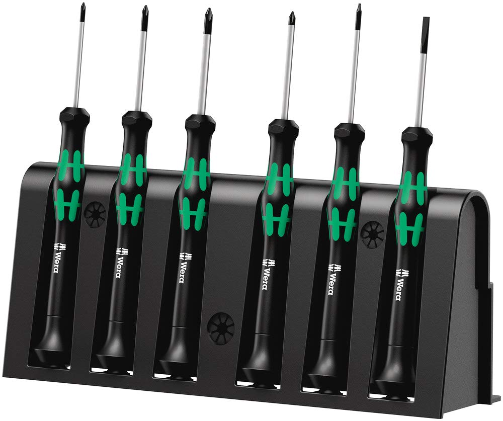 A Wera 2050/6 elektronikai csavarhúzó készlet 6 részes csavarhúzó készlet, réselt Phillips, Torx Plus tollal és Microstix (Torx 3-Lobe) csavarhúzókkal. A többkomponensű csavarhúzó fogantyú ergonómiailag korrekt munkát végez. A forgatható sapkának és a sapka alatti gyorsan elforduló zónának köszönhetően villámgyors csavarás lehetséges. Nincs szükség időigényes markolatcserére, mint a hagyományos precíziós csavarhúzóknál. A közvetlenül a penge fölötti precíziós zóna jó érzést nyújt a felhasználó számára a helyes forgásszög beállításához. A Wera Black Point hegy és a komplex edzési folyamat hosszú élettartamot és fokozott korrózióvédelmet tesz lehetővé. Az elektronikai technikus 2050/6 csavarhúzó készletét műanyag állványban szállítják, így a csavarhúzók mindig kéznél vannak.