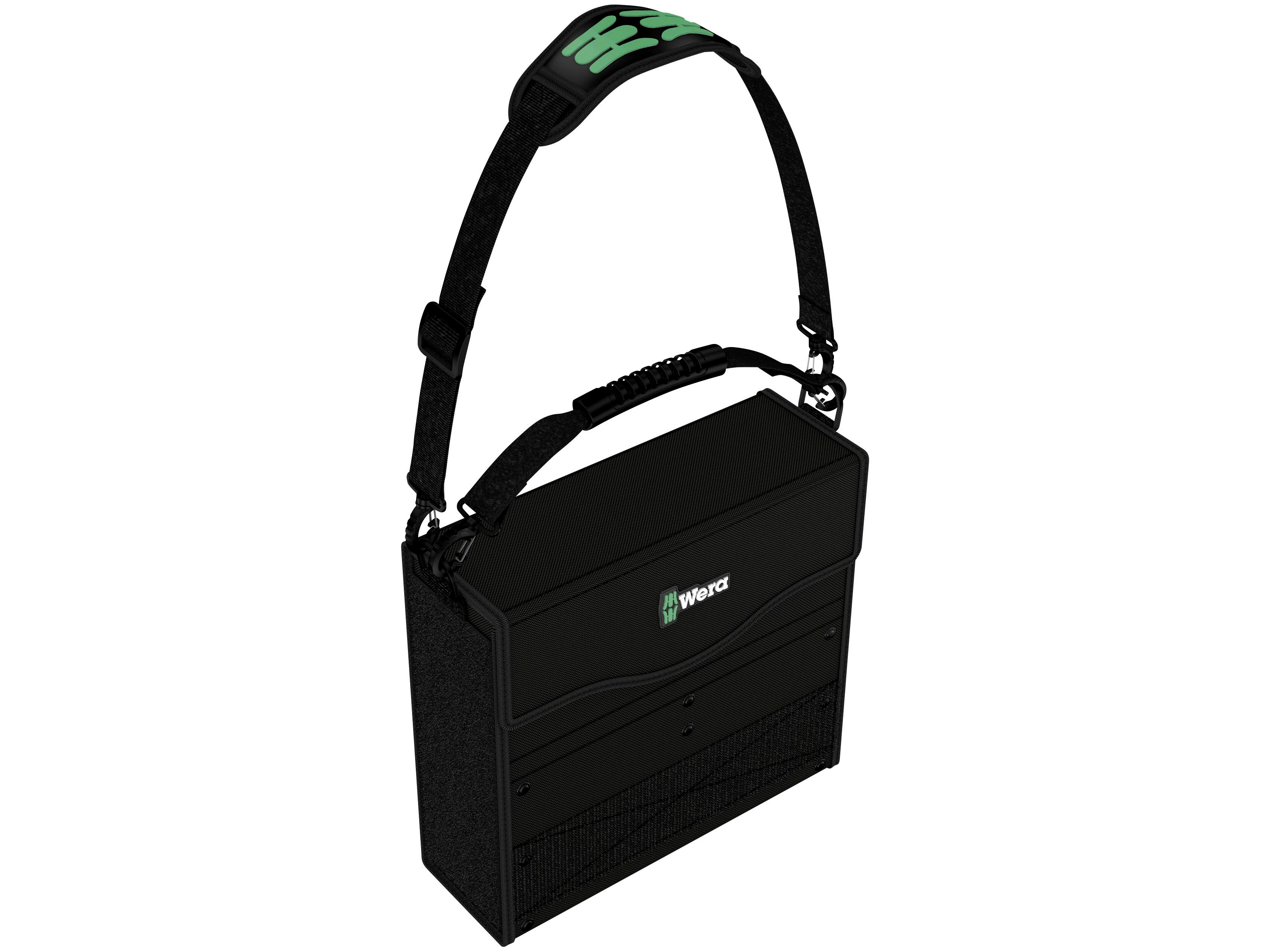 A Wera 2go 2 szerszámtartály könnyű és mobil szerszámtartó, tépőzáras és belső tépőzárral, ideális megoldás az egyedi és kényelmes szerszámszállításhoz. További Wera táskák és textildobozok tépőzárral a hátoldalán külön-külön egyszerűen és biztonságosan rögzíthetők a szerszámtartályhoz. A mellékelt csúszó, széles párnázású vállpántnak köszönhetően a kezed szabadon marad szállítás közben. A Wera 2go 2 biztosítja a könnyű poggyászt, mert csak a valóban szükséges eszközöket viszi magával. A szállítási terjedelem tartalmaz egy reszketőt egyénileg állítható tépőzárral a csavarhúzókhoz és egyéb szerszámokhoz.