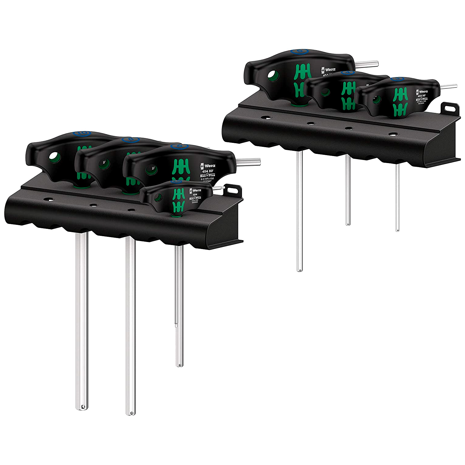 A Wera 454/7 HF 1. sz. T-fogantyú csavarhúzó készlet hét hatszögletű csavarhúzóból áll. A hosszabb láb tartási funkcióval rendelkezik. A kimeneti csúcs és a csavarprofil közötti felületi nyomásból adódó szorítóerő szilárdan tartja a csavarokat a szerszámon. Ez különösen hasznos a nehezen elérhető munkaterületeken, ahol a másik kezével nem lehet megfogni a csavart. A csavarhúzók Wera Hex-Plus profilúak. Nagyobb érintkezési felületeket kínál a csavarfejben, a bevágási hatás minimálisra csökken, és megakadályozzák a profil tönkremenetelét. Ugyanakkor akár 20% -kal nagyobb nyomaték is továbbítható. A kiegészítő rövid kar, amely kinéz a fogantyúból, lehetővé teszi a rendkívül nagy nyomatékok továbbítását a hosszú kar karként történő használatával. A fogantyú ergonómikus alakja jól kitölti a kézlabdát, az ujjak biztonságosan fekszenek a puhán lekerekített süllyesztett markolatokban. Az egész kéz érintkezésbe kerül a fogantyúval, és elkerülhetők a kéz és a fogantyú közötti súrlódási veszteségek. A "Vedd könnyedén" fogantyú jelölés a profilok szerinti színkóddal szintén biztosítja, hogy könnyebben megtalálható legyen a szerszámtáskában és a munkahelyen. A csavarhúzó készlethez két állvány tartozik, amelyek a falhoz rögzíthetők. Ez biztosítja a megfelelő tárolást és a gyors hozzáférést.
