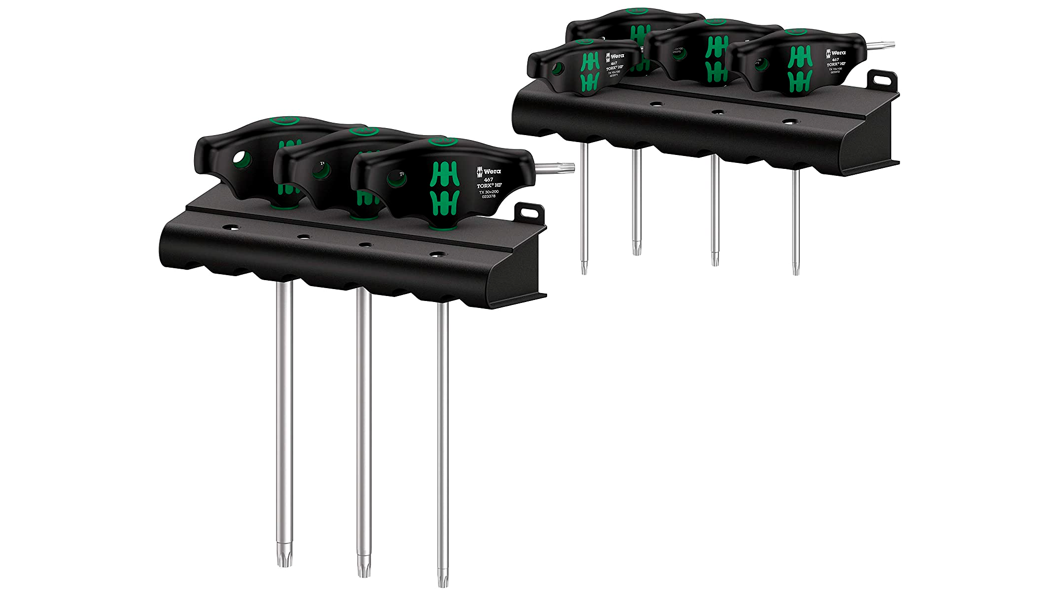 A Wera 467/7 TORX HF 1. sz. T-markolatú csavarhúzó készlet hét TORX profilú offset csavarhúzóból áll. A hosszabb láb tartási funkcióval van ellátva. A kimeneti csúcs és a csavarprofil közötti felületi nyomásból adódó szorítóerő szilárdan tartja a csavarokat a szerszámon. Ez különösen hasznos a nehezen elérhető munkaterületeken, ahol a másik kezével nem lehet megfogni a csavart. A kiegészítő rövid kar, amely kinéz a fogantyúból, lehetővé teszi a rendkívül nagy nyomatékok továbbítását a hosszú kar karként történő használatával. A fogantyú ergonómikus alakja jól kitölti a kézlabdát, az ujjak biztonságosan fekszenek a puhán lekerekített süllyesztett markolatokban. Az egész kéz érintkezésbe kerül a fogantyúval, és elkerülhetők a kéz és a fogantyú közötti súrlódási veszteségek. A "Vedd könnyedén" fogantyú jelölés a profilok szerinti színkóddal szintén biztosítja, hogy könnyebben megtalálható legyen a szerszámtáskában és a munkahelyen. A csavarhúzó készlethez két állvány tartozik, amelyek a falhoz rögzíthetők. Ez biztosítja a megfelelő tárolást és a gyors hozzáférést.