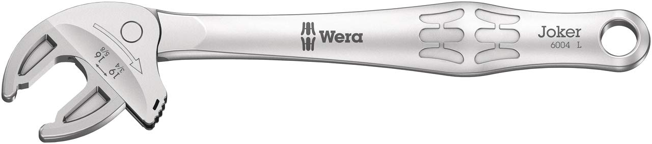 A Wera önbeállító nyitókulcsú Joker 6004 L univerzális csavarhúzó szerszám, sokféle felhasználási lehetőséggel. Több metrikus és birodalmi méretet ölel fel, és automatikusan igazodik a különböző csavarméretekhez. Biztonságosan markol, nem károsít semmit, és nagy munkasebességet tesz lehetővé. A fokozatmentes, párhuzamosan vezetett pofák több különálló kulcsot pótolnak. A szükséges méret automatikusan és automatikusan beállítja magát, ha a hatlapú anyára vagy csavarra helyezik. Az integrált karos mechanizmus biztonságosan rögzíti a csavart vagy anyát az állkapcsok között, ami jelentősen csökkenti a csúszás kockázatát. A Joker 6004 párhuzamos sima pofái felületi nyomást generálnak, és így megakadályozhatják az anya vagy a csavarfej "megfordulását", ami akkor fordulhat elő, amikor az áram a sarkokon át kerül továbbításra. Az integrált racsnis funkció gyors és folyamatos csavarozást biztosít eltávolítás nélkül. A sarokszélességű prizmák használatával csak 30 ° -os hátsó elfordulási szög érhető el. Az egylábú konstrukció a racsnis funkcióval és a sarokszélesség-prizmával együtt szűk helyeken történő munkát tesz lehetővé. Az állítható Joker 6004 L univerzális önbeállító csavarhúzó.
