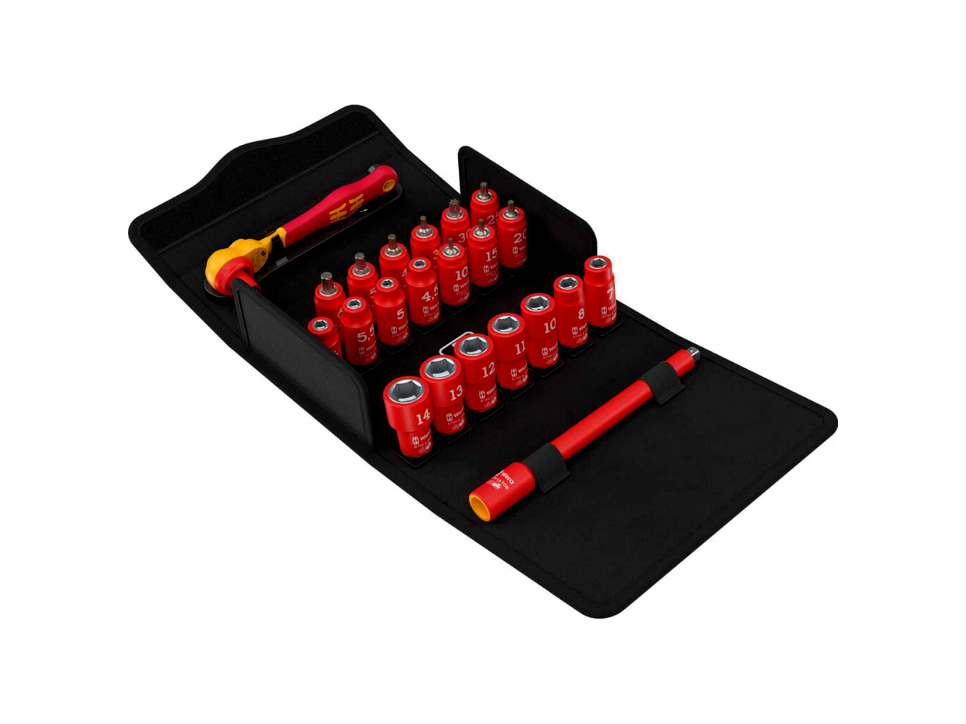 A Wera 22 részes, VDE minősítésű racsnis készlete kifejezetten elektromos szerelési és karbantartási munkákhoz készült, ahol a gyors, precíz és mindenekelőtt biztonságos munkavégzés elengedhetetlen. A gondosan összeállított készlet a finomfogazású Zyklop racsnitól a szigetelt dugókulcsokon és biteken át a praktikus textiltárolóig mindent tartalmaz, amire feszültség alatti vagy annak közelségében végzett szerelésnél szükség lehet.