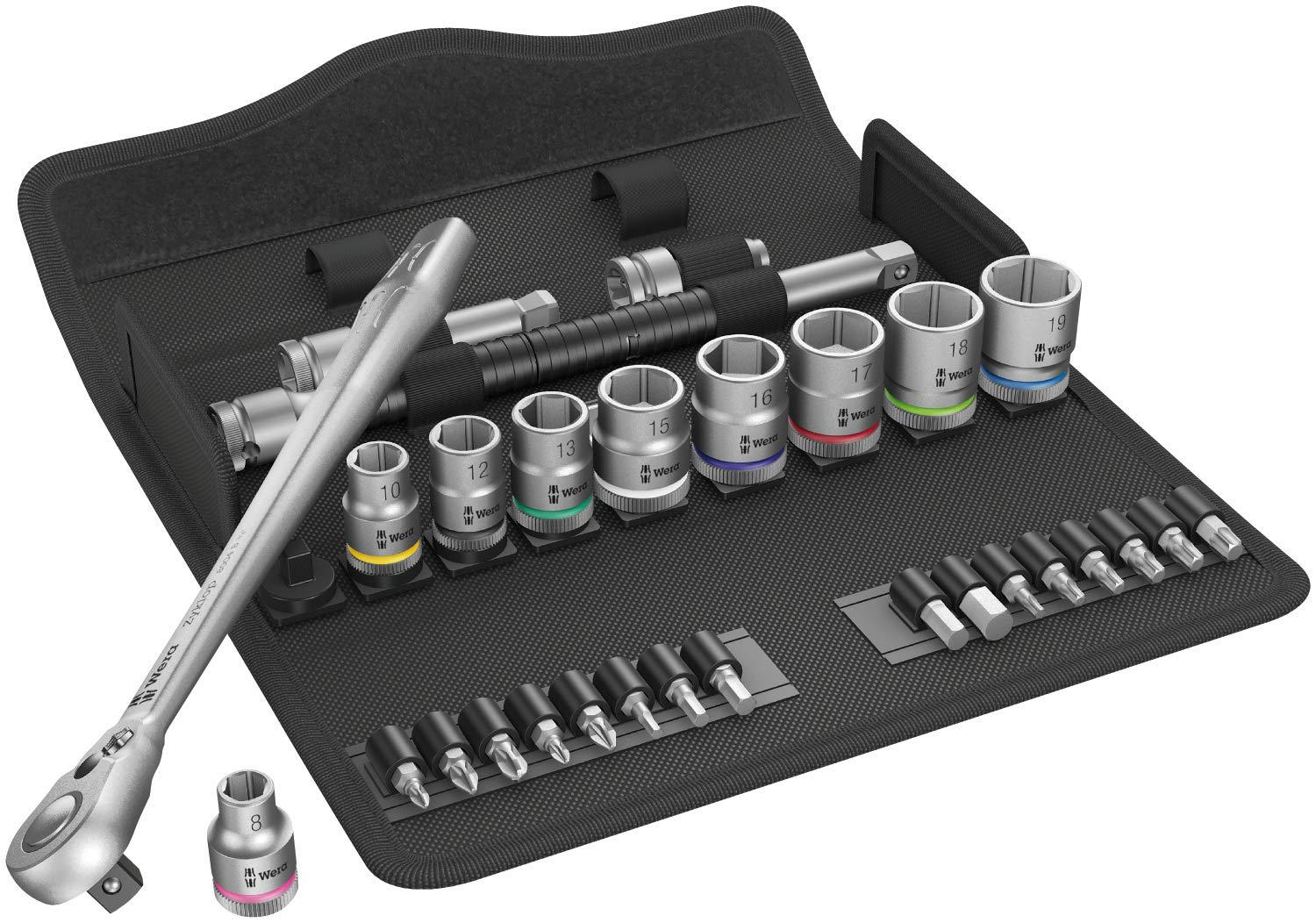A Wera 29 darabos Zyklop Metal 8100 SB8 racsnis készletét felületbarát textildobozban szállítjuk. A kompakt textildoboz a mobilitás és a helyigény meg nem feledhetetlen megkönnyebbüléséhez vezet. A szett jelentősen csökkentett súlya sokkal kényelmesebbé teszi a szállítást. A reszelés során az érzékeny felületek védettek. A textildoboz és az eszközök még sértetlenül is leesnek. A készlet tartalmaz egy Zyklop Metal racsnis kapcsolókart 3/8 "kimenettel, kilenc Zyklop aljzatot, egy Zyklop hosszabbítót (hosszú) egy gyors elfordítású hüvellyel, egy lengés meghosszabbítást, egy csatlakozó részt egy gyorsan cserélhető tokmánysal és 16 bitet. A kúpos négyzet lehetővé teszi a 15 ° -os elfordulást, így még a nehezen hozzáférhető csavarok is könnyebben elérhetők. A hatszög alakú foglalatok Wera Hex-Plus profilúak. Nagyobb érintkezési felületeket kínál a csavarfejben, ami minimálisra csökkenti a bevágási hatást és megakadályozza a profil megsemmisülését.
