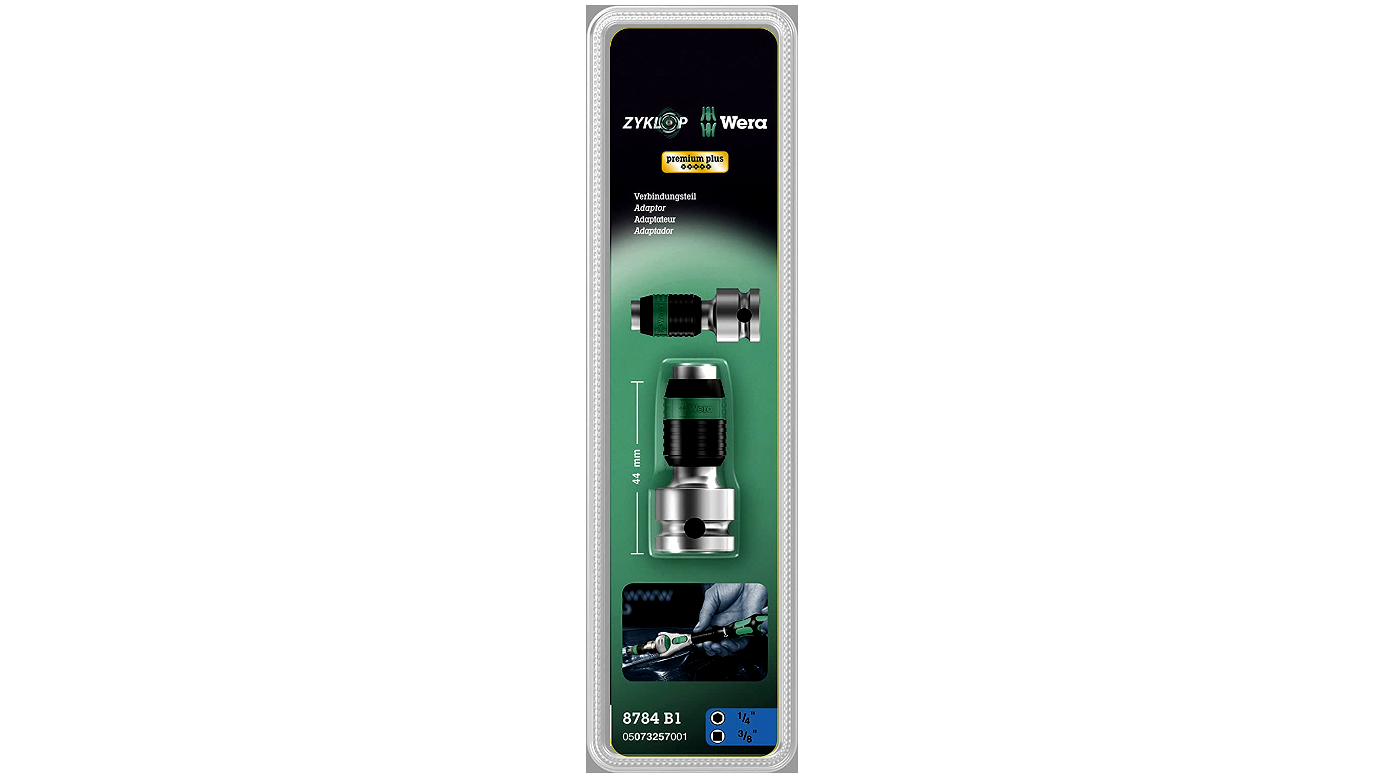 A Wera Zyklop 8784 B1 csatlakozó része négyszögtől hatszögig terjedő bitadapter. 1/4 "hatlapú bitekhez alkalmas a DIN ISO 1173-C 6.3 és E 6.3, valamint a Wera 1. és 4. sorozatok szerint. A 8784 B1 csatlakozó rész praktikus, gyorsan cserélhető tokmányt tartalmaz, és króm-vanádiumból készül. , tükröződésmentes matt, krómozott.