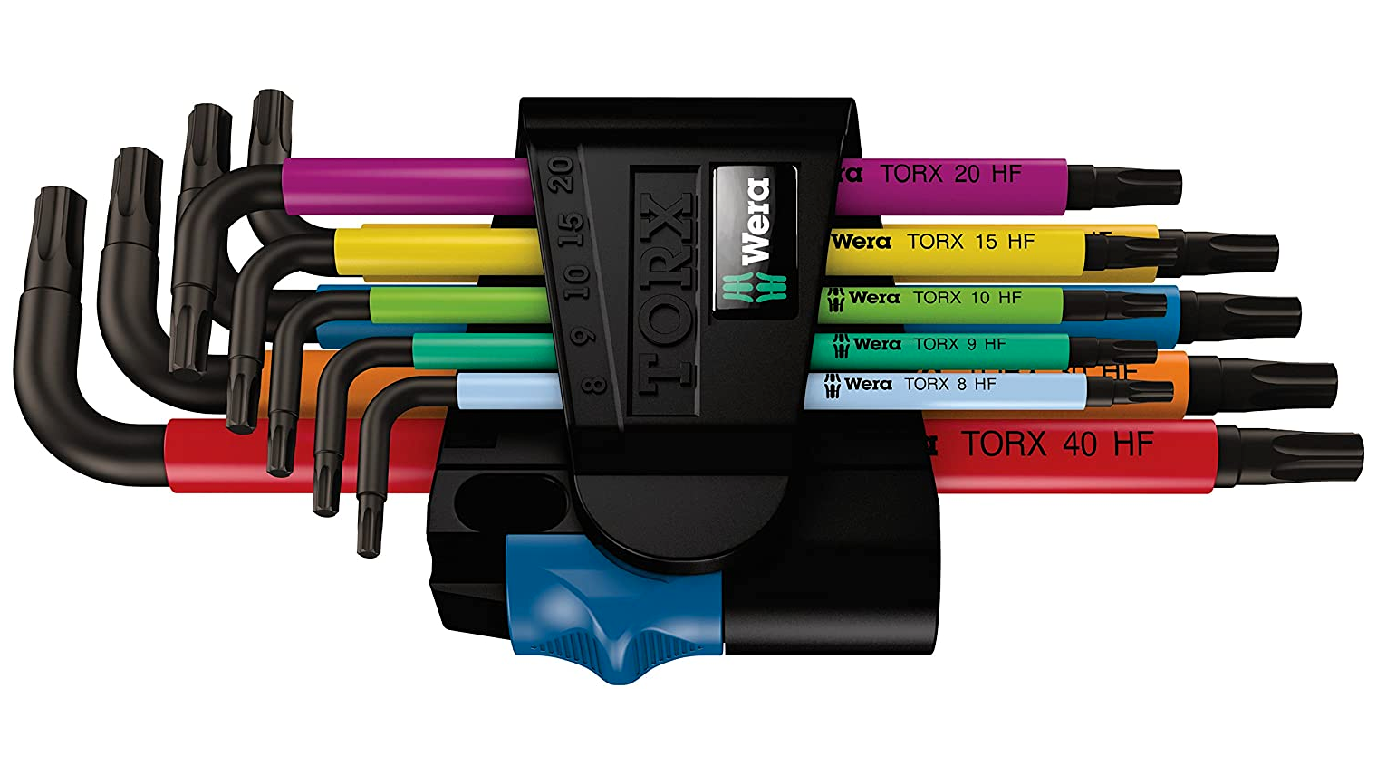 A Wera L-kulcsos 967 SL / 9 TORX HF Multicolour készlet 9 részt tartalmaz. A Wera TORX HF profil (HF = tartási funkció) speciális geometriával rendelkezik a tökéletes formaillesztés érdekében, és a kapott szorítóerő az Acument Global Technologies specifikációja szerint gyártott TORX csavarokat biztonságosan tartja a szerszám hegyén. Ez különösen hasznos, ha nehezen hozzáférhető helyeken csavarják. A műanyag bevonatú sarokkulcsok könnyen megfogható kerek anyagból készülnek. A bevonat alacsony hőmérsékleten is kényelmessé és biztonságossá teszi a munkát. A 967 SL / 9 TORX HF szett összes L-gombja színkódolásának és méretazonosításának köszönhetően gyorsan kéznél van. A rögzítőkapocs kopásmentes anyaga lehetővé teszi a sarokkulcs biztonságos rögzítését és könnyű eltávolítását.