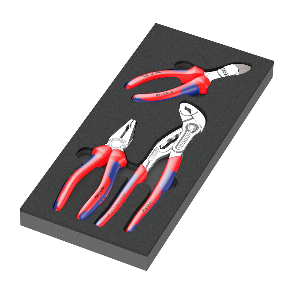 A Wera 9780 egy szerszámkészlet tartós habbetétben. A habbetét kétszínű a hiányzó alkatrészek gyors azonosításához, alkalmas a Tool Rebel görgős szekrényhez. A szett 1x Knipex kombinált fogóval, 1x Knipex Cobra High-Tech vízpumpa fogóval, valamint 1x Knipex nagy tőkeáttételű átlós vágóval felszerelve.