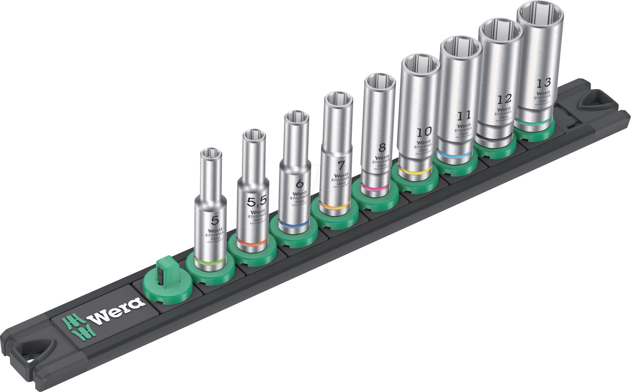 Anyamágneses rúd 9 hosszú kézi és gépi dugókulcsos kulcsbetéttel (nem ütésálló), ¼". A sima forgó mechanizmus biztosítja a biztonságos tartást és a foglalatok könnyű eltávolítását. Hosszú ¼" kézi és gépi dugókulcsok (ISO 2725-Part 3) a Wera-tól kézi és gépi (ütésmentes) használatra, még alacsonyan fekvő csavarkötések és kiálló menetes rudak esetén is. A Take it easy szerszámkereső a méretek szerinti színkódolással - a szükséges szerszám gyors és egyszerű megtalálásához. Könnyen megfogható, még olajos kézzel is. Hatszögletes profillal és golyófogó horonnyal. A hatszögletű profil lehetővé teszi a nagy erők átvitelét, és kevésbé terheli az anya vagy csavarfej éleit, mint a tizenkétoldalú profil. A finom fogazású racsnisok a kis visszatérési szögük miatt még szűk helyeken is szükségtelenné teszik a tizenkétoldalú profil használatát. Hatszögletű csavarokhoz és anyákhoz. A mágneses rúd lehetővé teszi a fémfelületekhez való ideiglenes rögzítést, és a csavarás-kioldás funkciónak köszönhetően biztonságos anyarögzítéssel és -kioldással rendelkezik.