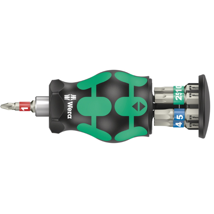 - 7 rozsdamentes acél bitet tartalmaz, amelyek közül 6 a markolatban lévő tárban és egy a bit tartóban található.