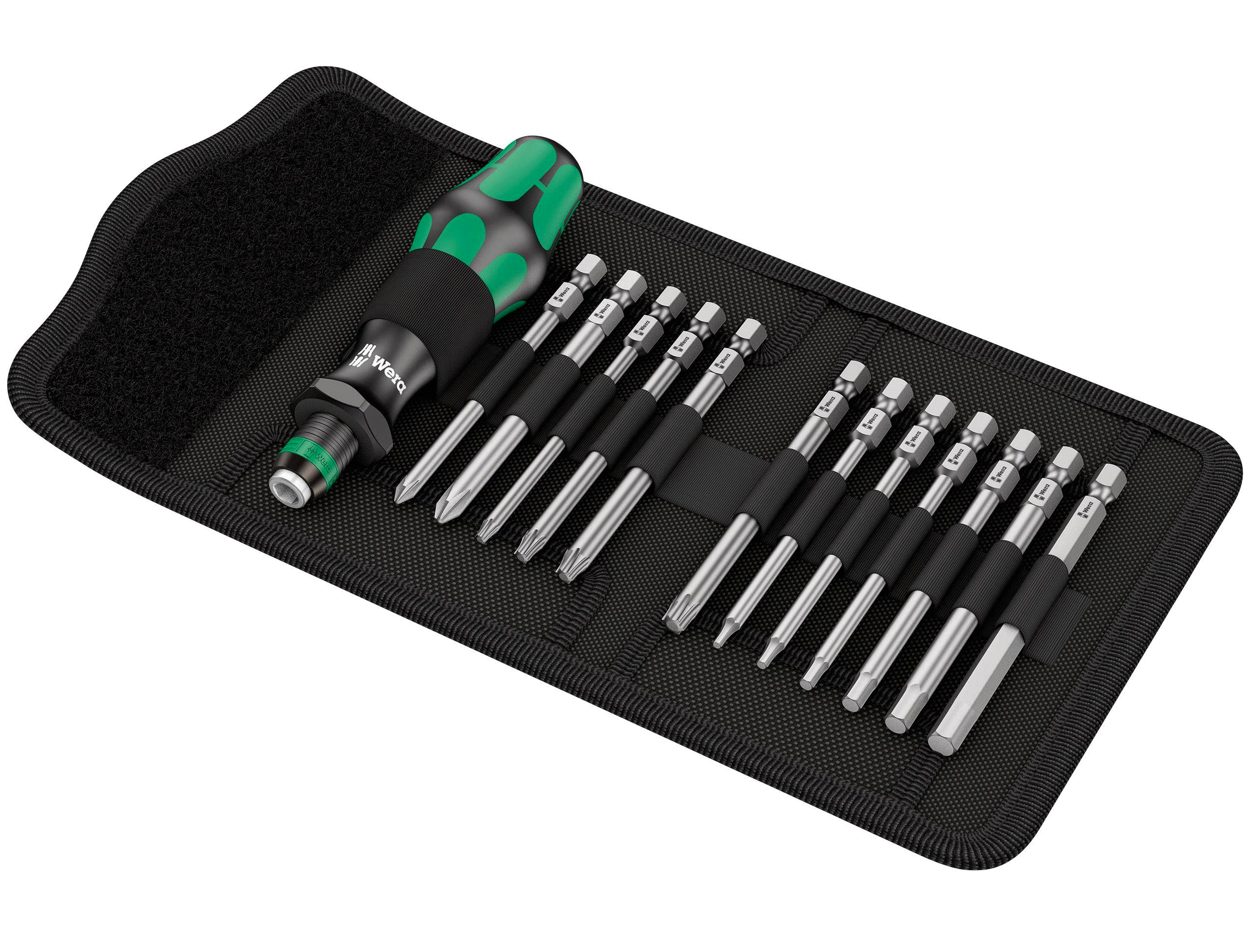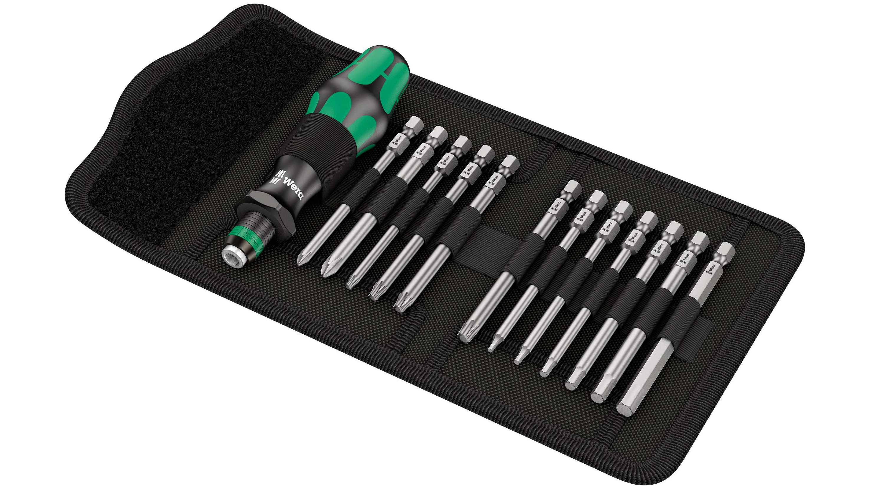 A kompakt, 13 részes kerékpárkészlet 2 praktikus alapválaszték az utcai, hegyi és e-kerékpárok összeszereléséhez és javításához. A könnyű, felületbarát, ugyanakkor robusztus textilszatyrot könnyen magával viheti. A Bicycle Set 2 12 kemény, 89 mm hosszú bitet és egy 816 R Kraftform bittartót tartalmaz Rapidaptor gyorscserélő tokmánnyal és többkomponensű Kraftform fogantyúval. A Rapidaptor gyorscserélő tokmány villámgyors bitcserét tesz lehetővé segédeszközök nélkül. Az erős állandó mágnes a helyén tartja a biteket. A Wera Hex-Plus profil, amellyel a hatlapfejű foglalatok vannak felszerelve, nagyobb érintkezési felületeket kínálnak a csavarfejben, a bevágási hatás minimálisra csökken, és megakadályozzák a profil megsemmisülését. Ugyanakkor akár 20% -kal nagyobb nyomaték is továbbítható.