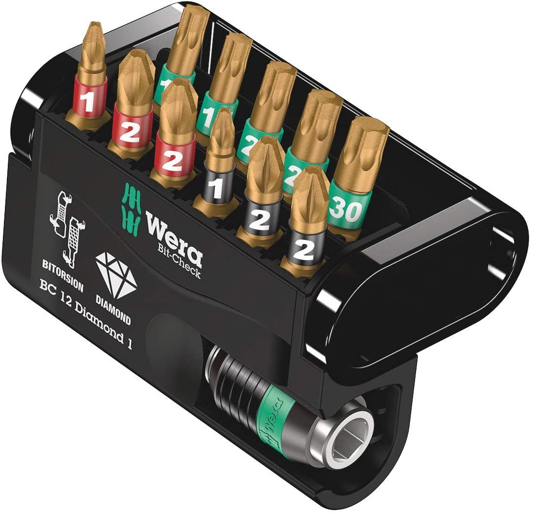 A 12 részes Wera Bit-Check 12 Diamond 1 készlet tizenegy 1/4 "-os, különböző profilú BiTorsion bitből és egy Rapidaptor bitartóból áll, gyorsan cserélhető tokmány és 1/4" hatszögletű. A bittartó Rapidaptor technológiával van felszerelve, amely lehetővé teszi a bitek felvételét a hüvely működtetése nélkül. A bitet úgy távolítják el, hogy egyszerűen előre tolják a villámgyors bitcseréhez, akár csak egy kézzel is. A tizenegy BiTorsion bit gyémánt bevonattal rendelkezik a csúszás kockázatának csökkentése érdekében. A bit hegyén található apró gyémánt részecskék biztosítják a csavar biztonságos illeszkedését és csökkentik a szükséges érintkezési nyomást. A BiTorsion rendszer hosszabb élettartamot biztosít azáltal, hogy a tengely keménységét a kimeneti csúcshoz képest körülbelül 20% -kal csökkenti egy célzott temperálási folyamat révén. Ez a torziós zóna nagyobb terheléseket csillapít. A Bit-Checks kinyitható a munkahelyen, így az eszköz mindig gyorsan kézbe vehető.