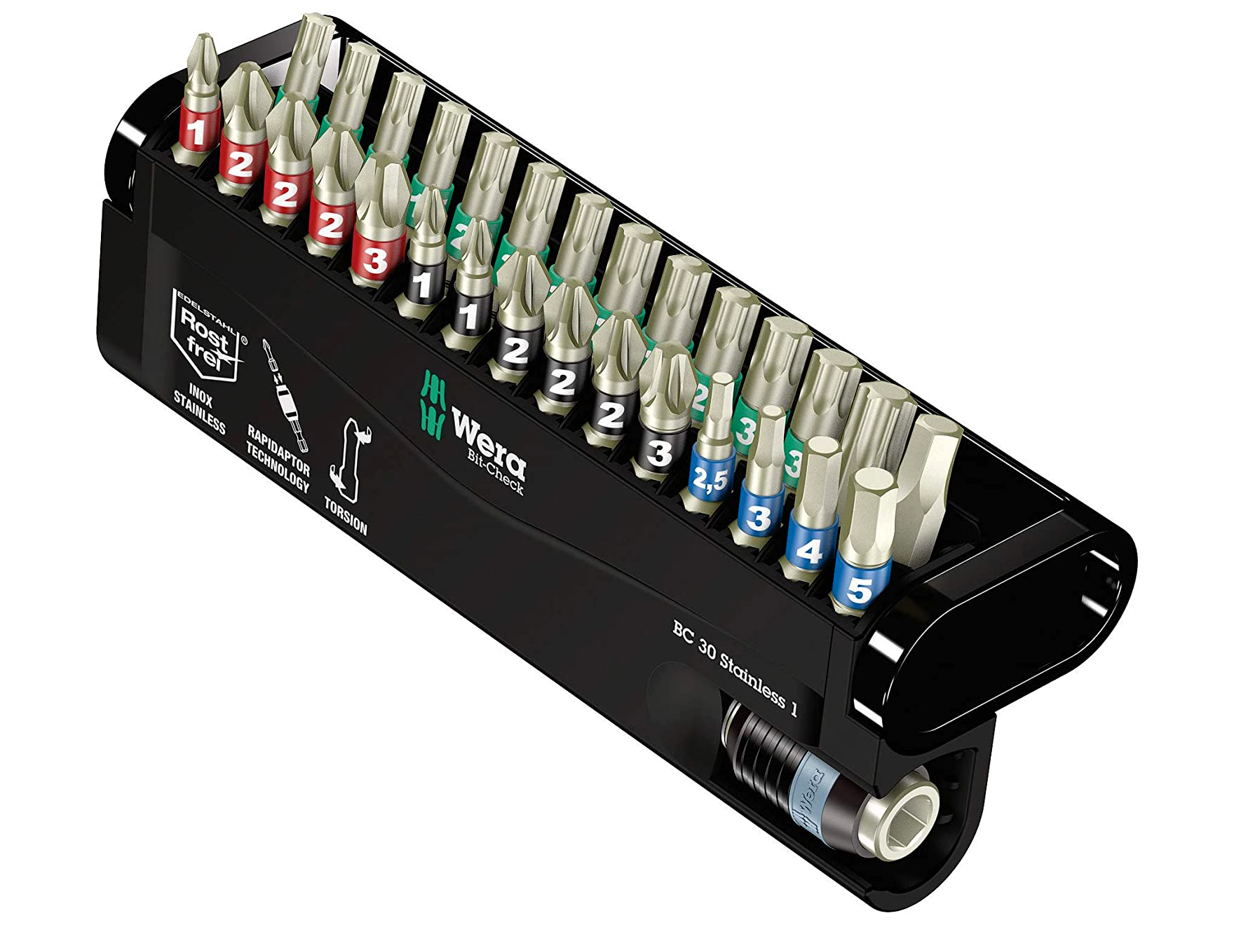 A 30 darabos Wera Bit-Check 30 Stainless 1 készlet 29 különböző profilú bitből és 3888/4/1 K rozsdamentes acél tartóból áll, 1/4 "hatszögletű, csavarhúzókhoz alkalmas, a DIN ISO 1173-F szerinti tartóval 6.3. A bittartó Rapidaptor technológiával van felszerelve, amely lehetővé teszi a bitek felemelését a hüvely működtetése nélkül. A bit eltávolítható egyszerűen előre tolva, villámgyors bitcserékhez, akár csak egy kézzel is A bitek szintén rozsdamentes acélból készülnek. A Wera rozsdamentes acél szerszámai vákuummal edzettek, és így rendelkeznek a csavarozáshoz szükséges keménységgel és szilárdsággal. Ipari felhasználás korlátozások nélkül lehetséges. A bitellenőrzések a munkahelyen kinyithatók, így a szerszám mindig gyors kéznél.