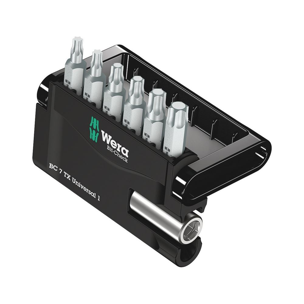 6 Wera TORX® bit rendezetten, minimális helyen elhelyezve egy praktikus Bit-Checkben. Kemény viszkózus Wera bitek hatlapfejű csavarokhoz és univerzális használatra. 1 db 893/4/1 K univerzális tartó az elektromos csavarhúzóba való behelyezéshez vagy az elektromos fúrógép tokmányába való használathoz.