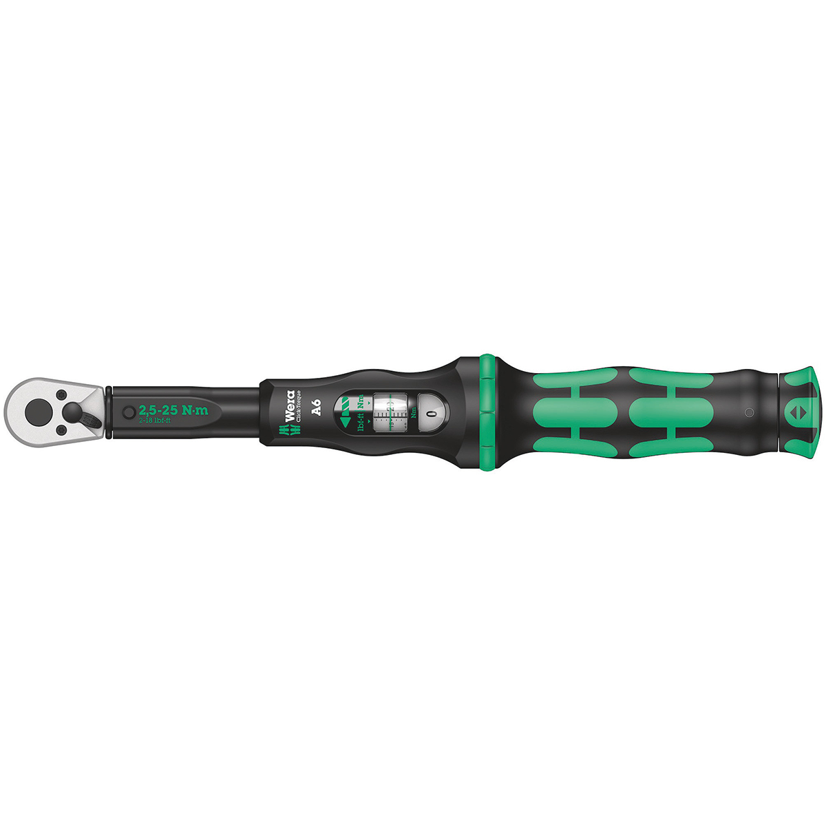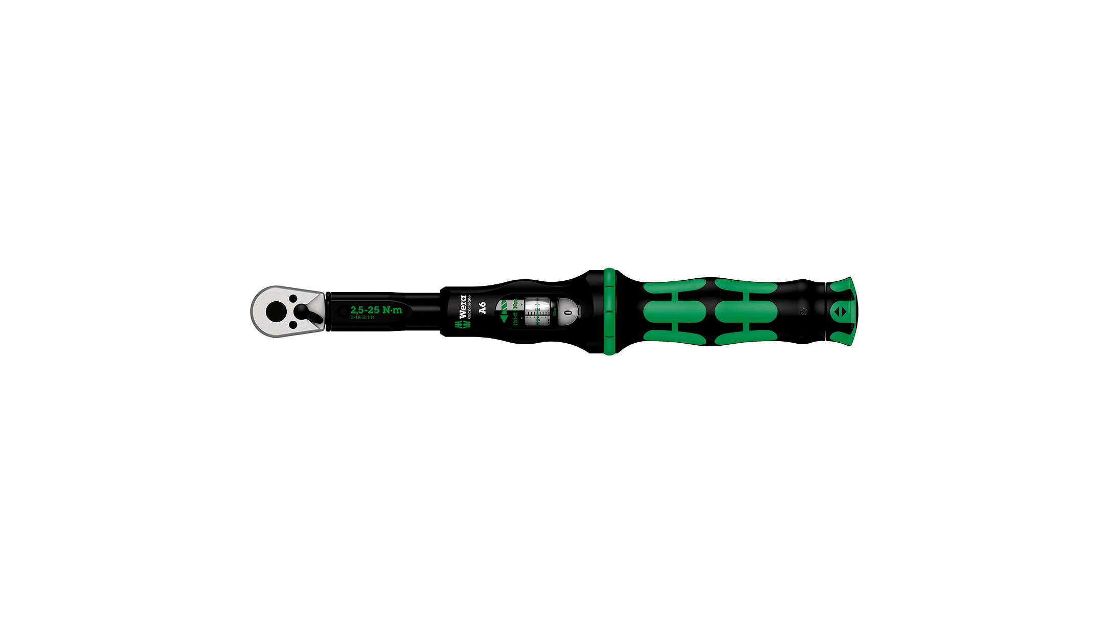 A Click-Torque A 6 egy kattintós nyomatékkulcs az összetéveszthetetlen Wera dizájnban, nagyon robusztus kivitelben. A DIN EN ISO 6789-1:2017-07 szabvány szerinti nagy pontossággal nyűgöz le. Az előre beállított érték könnyen beállítható és rögzíthető. A skálaértékek elérésekor hallható és tapintható bekapcsolás ezen felül megkönnyíti a kívánt nyomatékérték biztonságos beállítását. A robusztus kioldó mechanizmus biztosítja, hogy a beállított nyomaték elérésekor jól hallható és érzékelhető kioldójelzést adjon. A Click-Torque A 6 jobbkezes meghúzáshoz készült, és 45 fogú, megfordítható racsnija van.