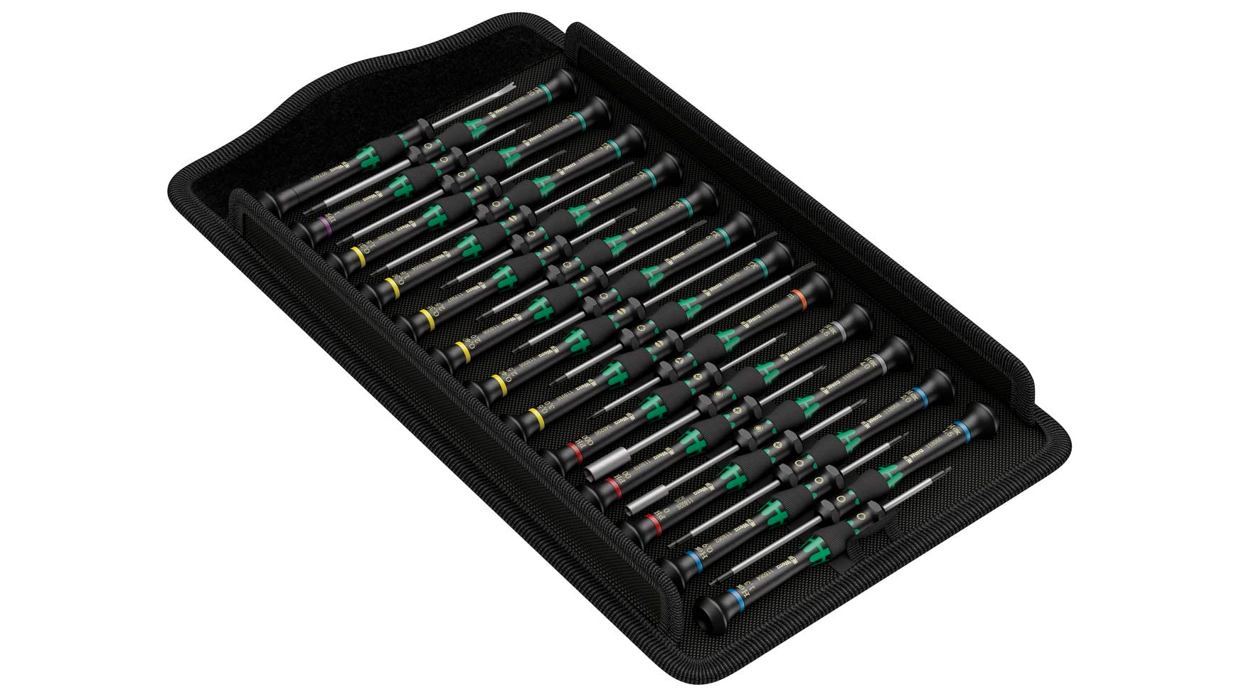 A Wera Kraftform Micro Big Pack 1 egy 12 részes elektronikus csavarhúzó készlet a precíziós csavaros csatlakozásokhoz, beleértve az emelőt az áramköri lapokon lévő beragadt alkatrészek eltávolításához az éktelenítés után. A "Vedd könnyedén" szerszámkeresővel ellátott csavarhúzókat a profil és a méret bélyegzői szerint színkóddal látják el, hogy a kívánt szerszámot gyorsan és egyszerűen megtalálják. A Wera által kifejlesztett TORX HF profilt az eredeti TORX profil geometriai optimalizálása jellemzi. A kimeneti csúcs és a csavarprofil közötti felületi nyomásból adódó szorítóerő biztosítja, hogy a TORX csavarokat biztonságosan tartsák a szerszámon. Ez különösen hasznos a nehezen elérhető munkaterületeken, ahol a másik kezével nem lehet megfogni a csavart. A többkomponensű csavarhúzó fogantyú ergonómiailag korrekt munkát végez. A forgatható sapkának és a sapka alatti gyorsan elforduló zónának köszönhetően villámgyors csavarás lehetséges. Nincs szükség időigényes markolatcserére, mint a hagyományos precíziós csavarhúzóknál. A precíziós zóna közvetlenül a penge felett jó érzést nyújt a felhasználó számára a helyes elfordulási szögért a beállításhoz. A Wera Black Point hegy és a komplex edzési folyamat hosszú élettartamot és fokozott korrózióvédelmet tesz lehetővé. A Kraftform Micro Big Pack 1 robusztus és kompakt összecsukható táskával van ellátva.