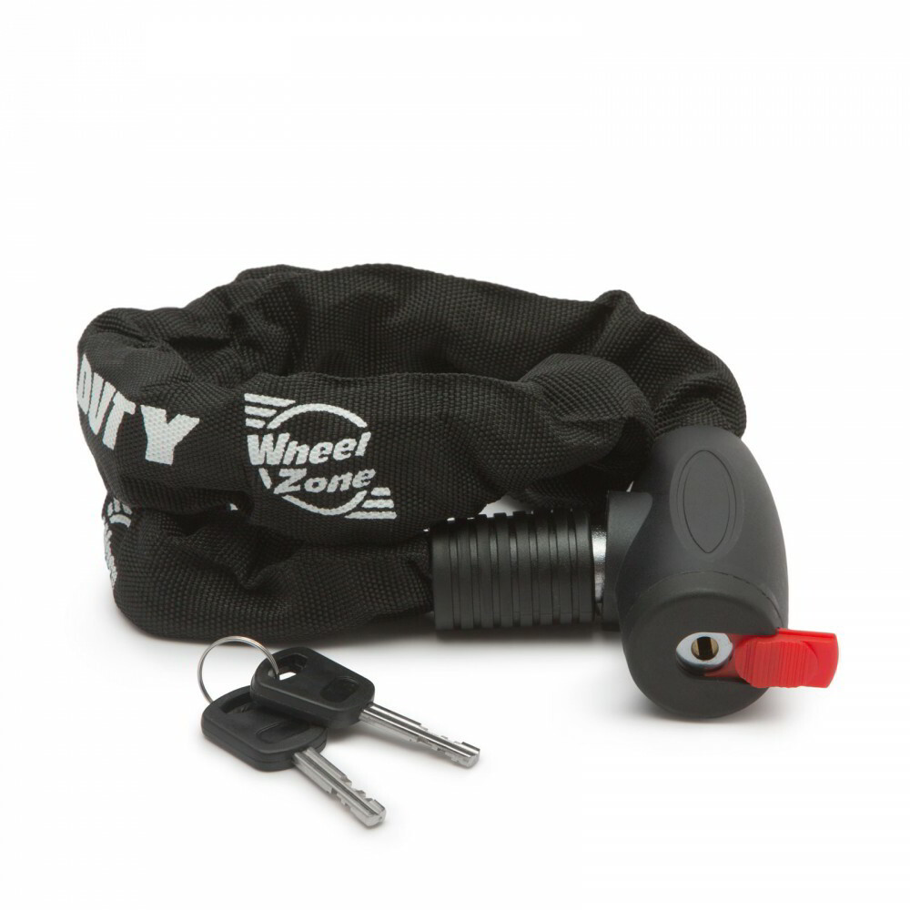 A szövettel bevont acéllánc ellenállóbb a vágó támadásokkal szemben. Minőségi zárszerkezet, 2 db kulccsal.
