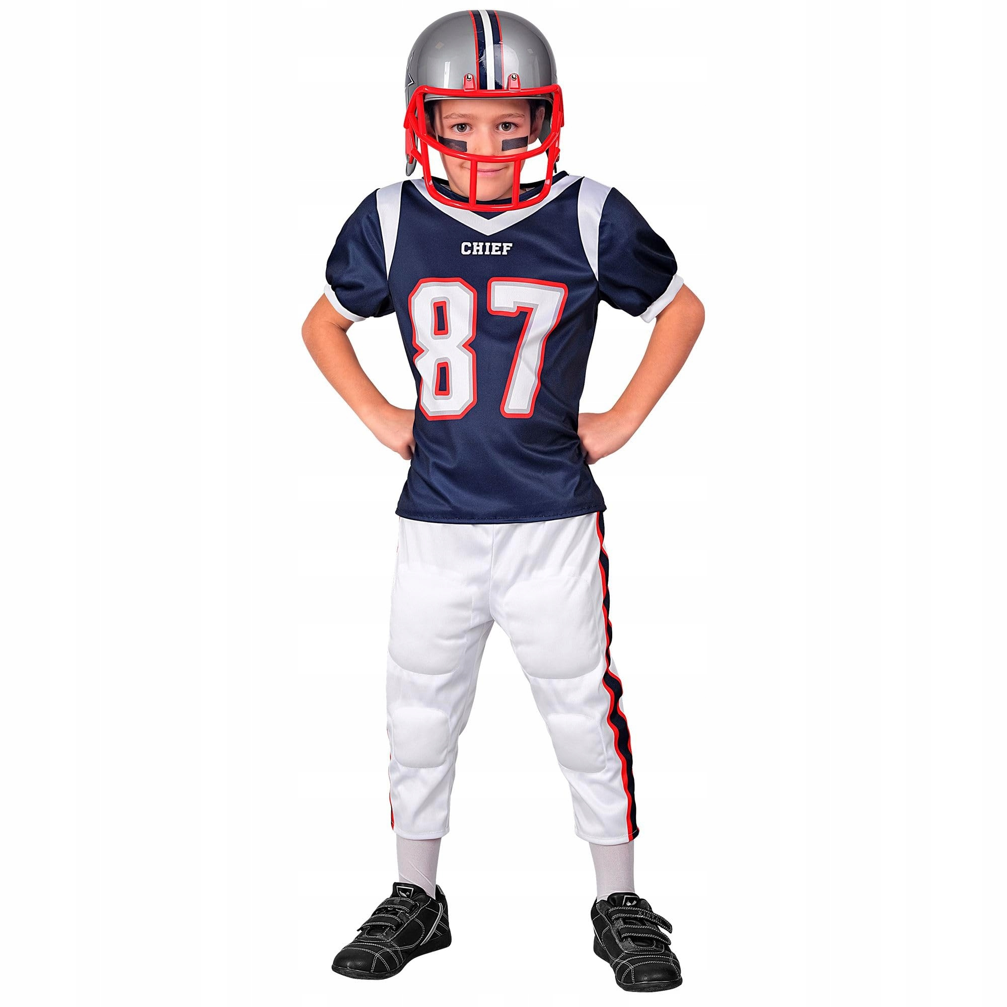 Ez a vagány, amerikai focis jelmez kifejezetten a 13–14 éves, 164 cm magas gyerekekre lett tervezve, akik rajonganak a látványos sportokért és a magabiztos, dinamikus megjelenésért. Részletgazdag kialakítása és sportos szabása igazi pályahangulatot teremt, így viselője könnyedén beleképzelheti magát egy profi amerikai focista szerepébe – akár farsangon, akár tematikus bulin, akár otthoni szerepjáték során.