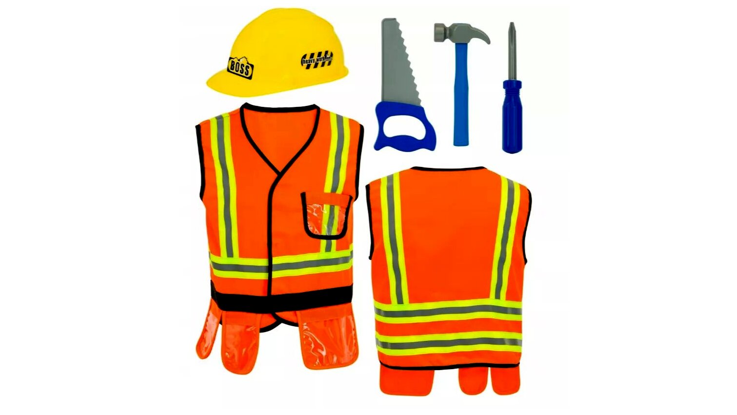 Tartalom: narancssárga mellény fényvisszaverő csíkokkal; sárga védősisak; játék kalapács; játék fűrész; játék csavarhúzó; mellény zsebekkel