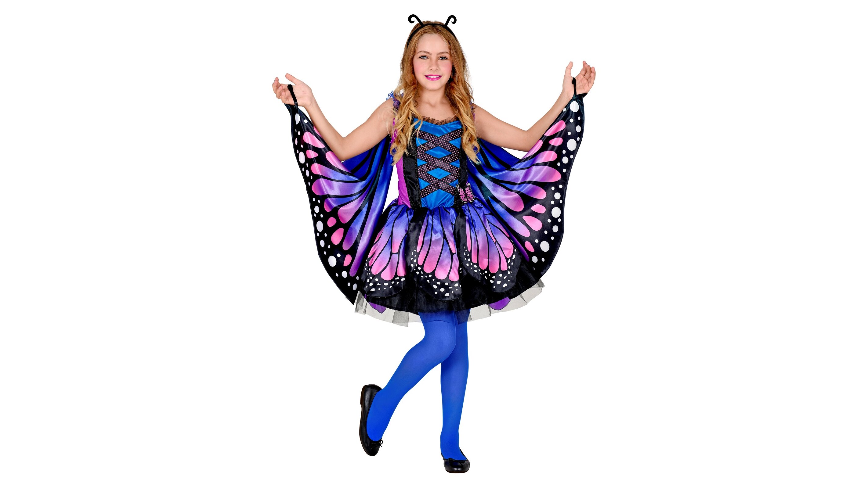 A lányok egy gyönyörű, rózsaszín és kék színátmenetes pillangóvá válhatnak a farsangon. A jelmezhez hozzá tartoznak a csodálatos szárnyak is, ami a vállakra téve kinyílik, ha a kezüket mozgatják, továbbá egy kis fekete csáp hajpánt is.