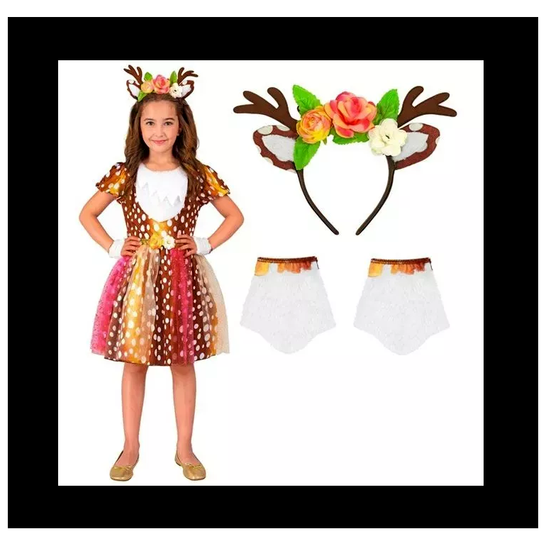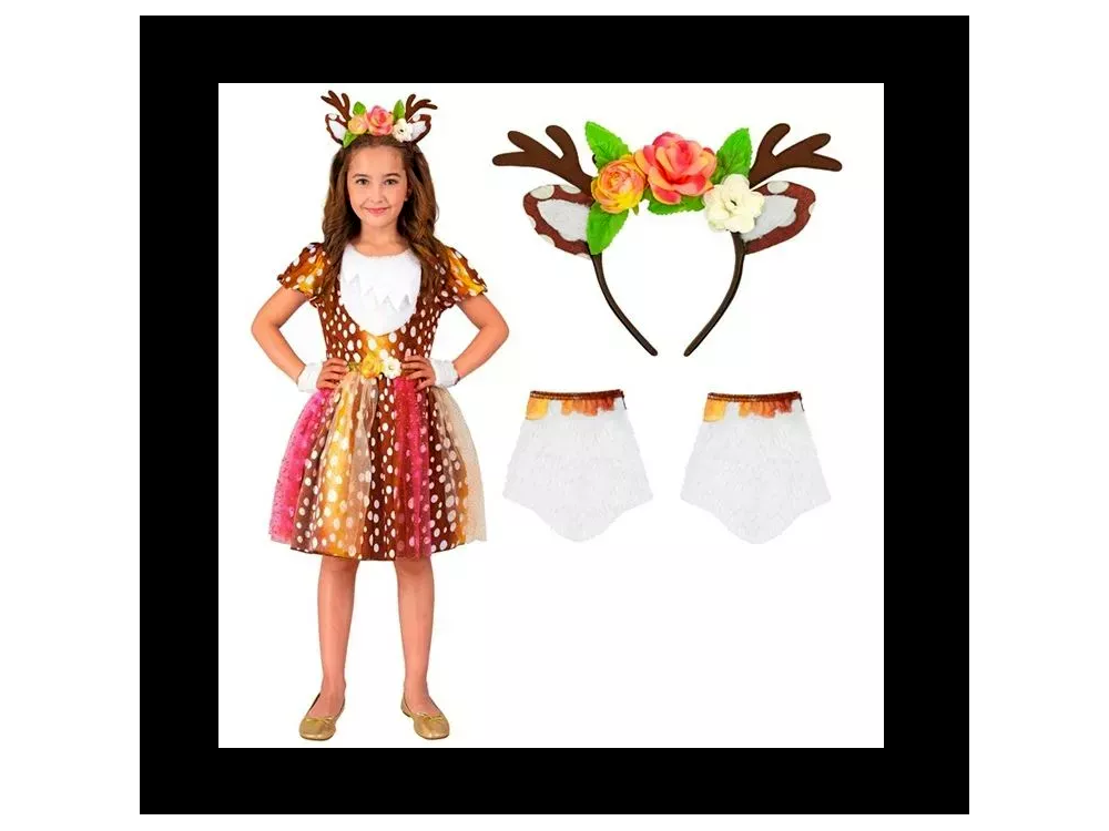 Ez a bájos, erdei hangulatú jelmez szett igazi álom minden 7–8 éves gyerek számára, aki szeret belebújni egy kedves mesefigura bőrébe. A pöttyös, „őzike-mintás” ruha, a színes tüll szoknya és a virágokkal díszített agancsos fejdísz együtt egy igazán különleges, egyedi megjelenést ad, amely bármely jelmezbálon, farsangi felvonuláson vagy iskolai műsoron azonnal a figyelem középpontjába kerül.