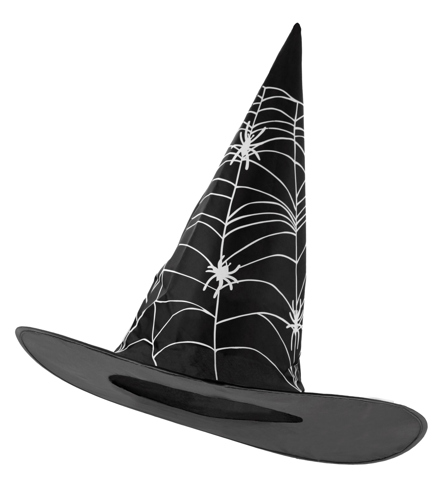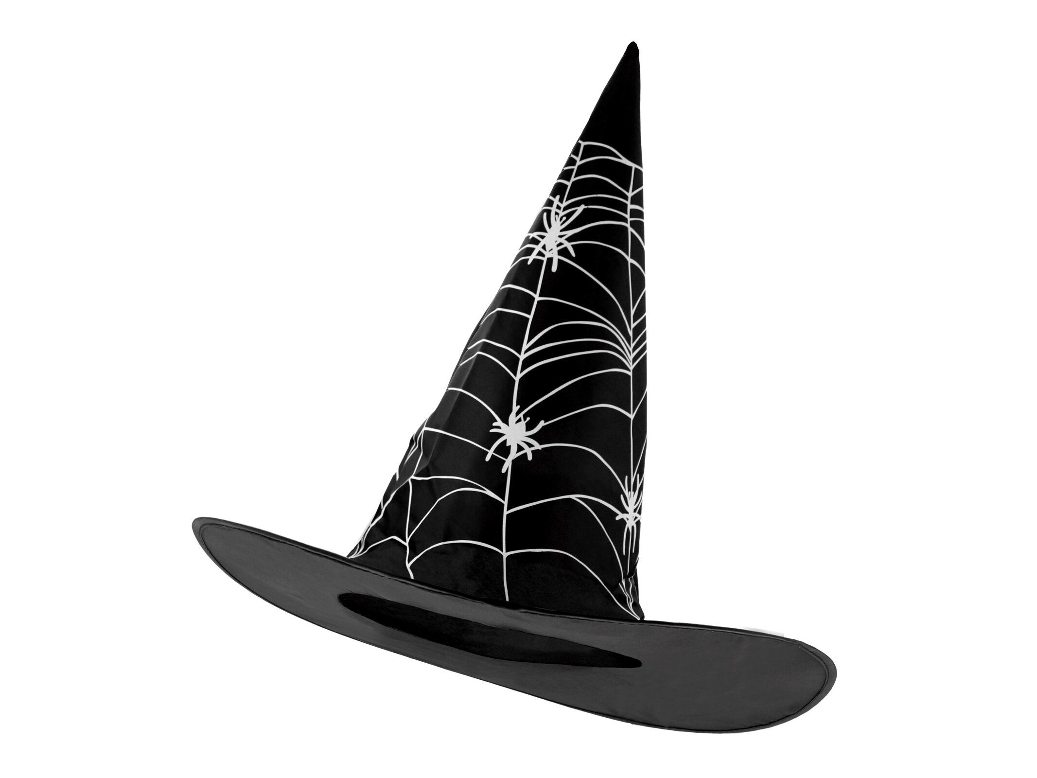 Fekete, fehér színű pókháló mintás boszorkány kalap.