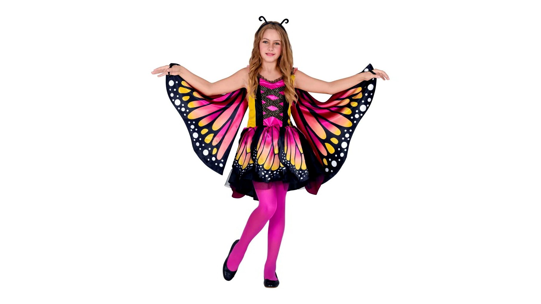 A lányok egy gyönyörű, rózsaszín és kék színátmenetes pillangóvá válhatnak a farsangon. A jelmezhez hozzá tartoznak a csodálatos szárnyak is, ami a vállakra téve kinyílik, ha a kezüket mozgatják, továbbá egy kis fekete csáp hajpánt is.