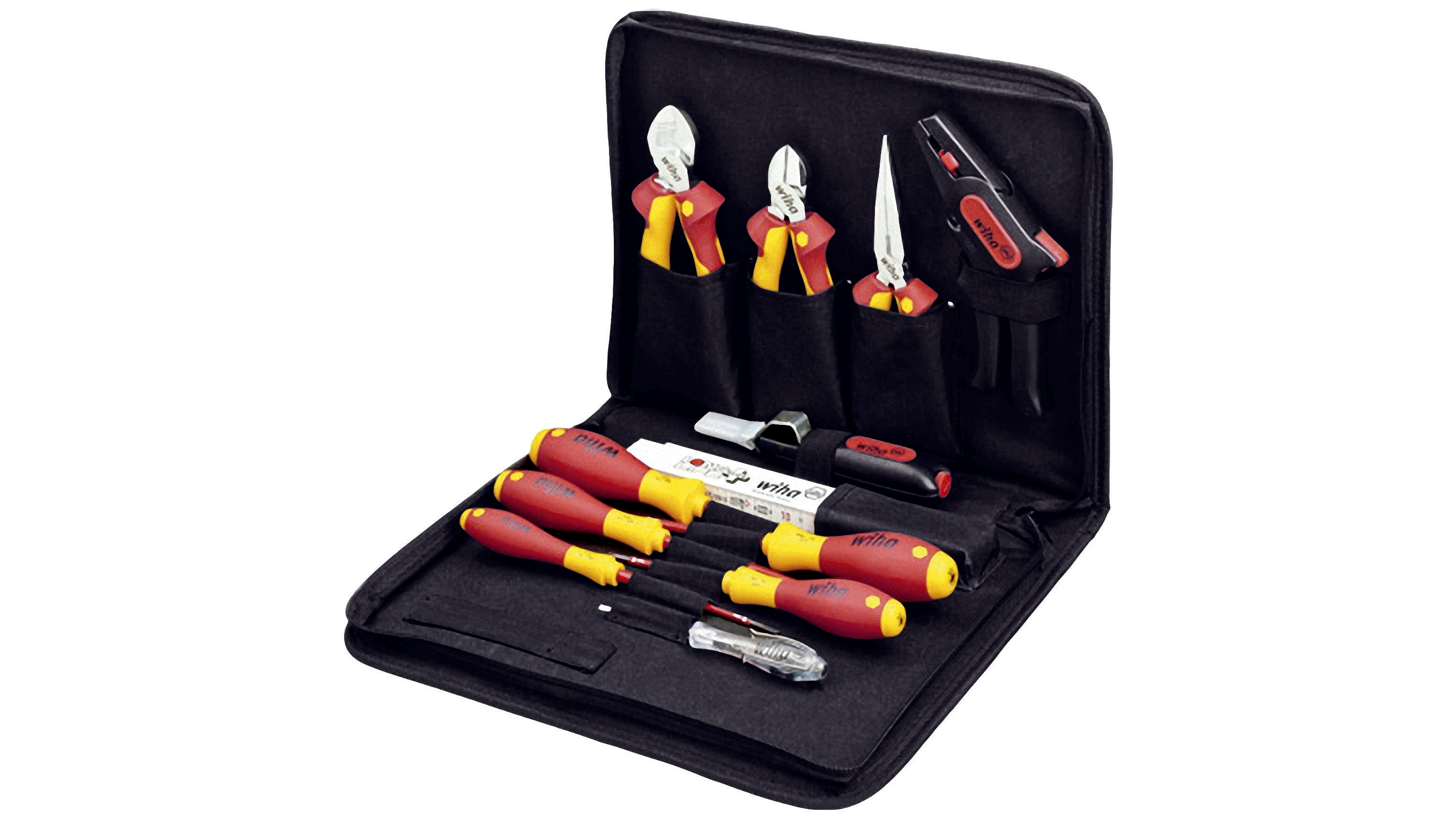 A 13 db. A szerszámkészlet válogatott kéziszerszámokat tartalmaz a leggyakoribb villanyszerelői alkalmazásokhoz. A teljesen összecsukható szerszámtáska cipzárral, hordozó fogantyúval és zsebekkel a kéziszerszámok számára elegendő helyet és áttekinthető elrendezést kínál. A különösen vékony pengének köszönhetően a szigetelt SoftFinish elektromos SlimFix csavarhúzókkal a mélyen fekvő csavar- és rugóelemek is könnyedén elérhetők. A szerszámtáskában kábelvágó, tűfogó és nagy teherbírású oldalvágó is található DynamicJoint technológiával az optimális kézi erőátvitel érdekében. Más, kifejezetten a villanyszerelő feladataira szabott szerszámok egészítik ki az igényes villanyszerelők számára készült szerszámkészletet. A szerszámokat egyenként tesztelik 10 000 V AC feszültségen,