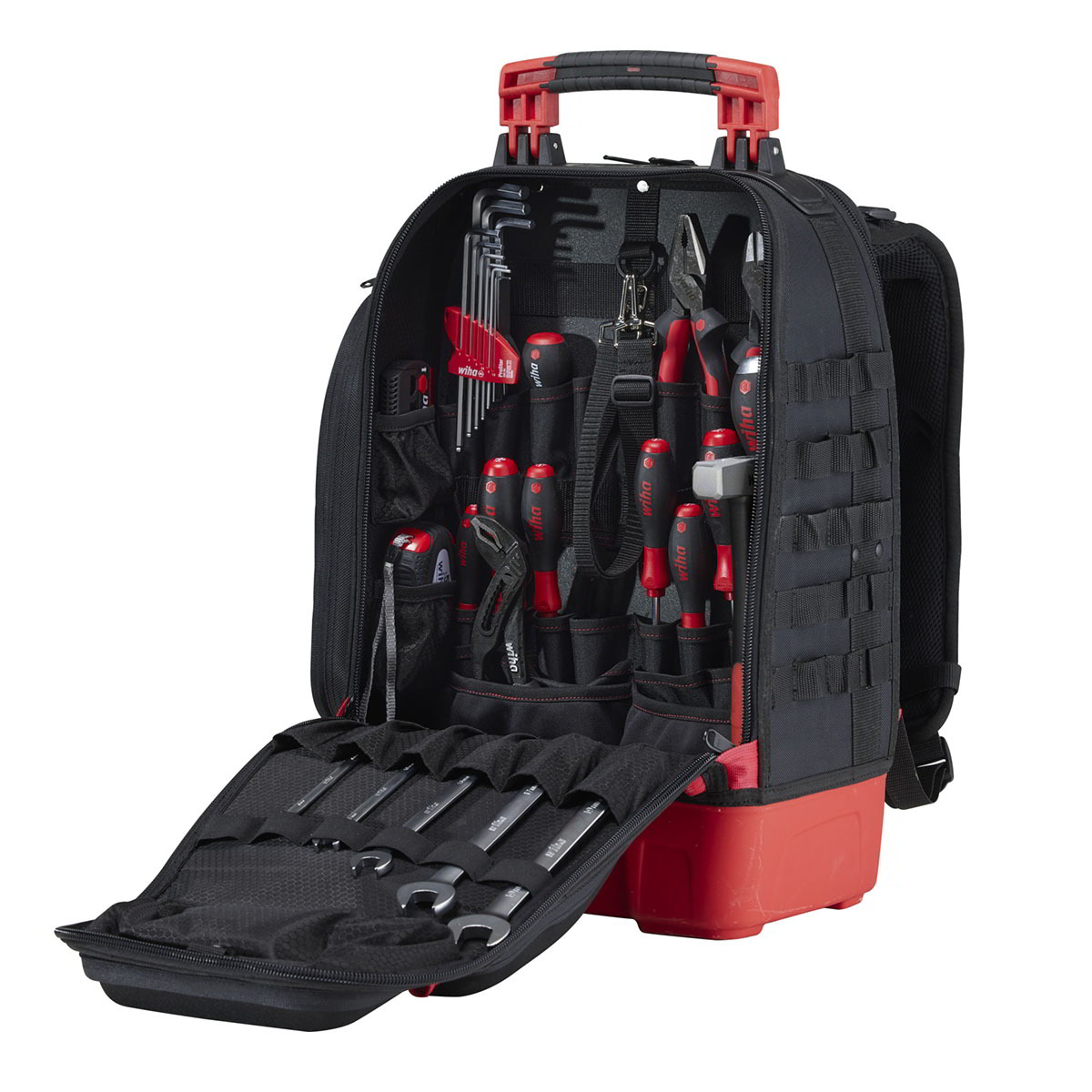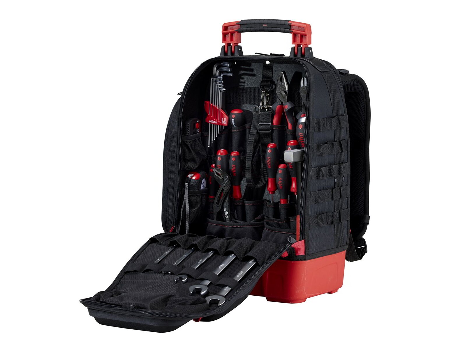 Akinek tele van mindkét keze, annak két szabad kézre van szüksége. A Wiha villanyszerelő hátizsákja a tökéletes megoldás, és védett kialakításával korlátlan szabadságot biztosít. A kifinomult rekeszrendszer áttekinthető rendszerezést és a szerszámok egyszerű kivételét kínálja. Ha a hátizsák 1/3-ig van kinyitva, praktikus gyors hozzáférési lehetőséget is kínál. Összesen 77 tárolási és 30 rugalmas rögzítési lehetőség teszi lehetővé a testreszabási lehetőségeket további szerszámokkal és tartozékokkal. A hátizsák robusztus alsó része stabil állvánnyal biztosítja, hogy a hátizsák nyitott állapotban is biztonságosan álljon. Ráadásul a tartós anyagnak köszönhetően nedves és piszkos munkakörülmények között is jól használható. Ezenkívül a szerszámos hátizsák nem csak egy műhely út közben, hanem mobil iroda is. A laptop- és az irodai rekesz lehetővé teszi a laptop, a mobiltelefon és a dokumentumok biztonságos és tiszta tárolását, a szerszámoktól elkülönítve. A kényelmes hordozhatóság érdekében a hátizsák állítható és légáteresztő hordozóelemekkel, valamint robusztus, csúszásmentes fogantyúval rendelkezik. A kiváló minőségű 1680D felső anyagnak és az YKK cipzáraknak köszönhetően megfelel a legmagasabb minőségi követelményeknek. A hátizsák külön, párnázott rekeszekkel is rendelkezik a privát vagy az érzékeny holmikhoz. A tíz részes imbuszkulcs készlet és a 14 részes bitkészlet mellett hét ergonomikus csavarhúzót és egy kis kompakt Stubby-t is tartalmaz. Minden tartási, bevezetési és vágási feladat megoldható a kombinált és vízpumpafogóval, valamint a nagy teherbírású erő kímélő oldalcsípőfogóval. A Wiha lakatoskalapács, a mérőszalag és az öt gyűrűs racsnis kulcs teszi teljessé a kisiparos mobil készletét. A hátizsák az univerzális Molle-rendszernek köszönhetően egyedileg bővíthető. A praktikus hurkoknak köszönhetően az interneten számos kiegészítő található a hátizsák kiegészítésére és bővítésére (nem része a szállítási terjedelemnek). A professzionális szerszámos hátizsákkal és a kiváló minőségű Wiha szerszámokból álló mobil felszereléssel mindig minden kéznél van! A hátizsák ideális mobil használatra, és maximális szabadságot biztosít a kéznek és az alkalmazási helynek.