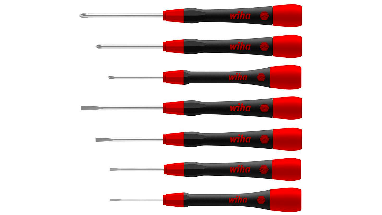 A Wiha 42991 szett hét különböző profilú és méretű PicoFinish precíziós csavarhúzót tartalmaz. A PicoFinish precíziós vagy elektronikai csavarhúzók ideálisak a finom és filigrán munkához a precíziós mechanikában, valamint a hobbi- és modellgyártásban hosszú, vékony fogantyúiknak és a gyorsan elforduló zónának köszönhetően. Az ergonómikus, puha zónával ellátott fogantyúk kényelmes munkavégzést tesznek lehetővé, a sima forgatható sapka pedig a gyors és érzékeny forgatást segíti. A precíziós mechanikus csavaros csatlakozásokkal az a kihívás, hogy nagyon pontosan és érzékenyen dolgozzanak anélkül, hogy károsítanák az érzékeny munkadarabot. A forgó sapkára nyomtatott csavarhúzó szimbólumok megkönnyítik a megfelelő csavarhúzó profil kiválasztását a szerszámtáskában.