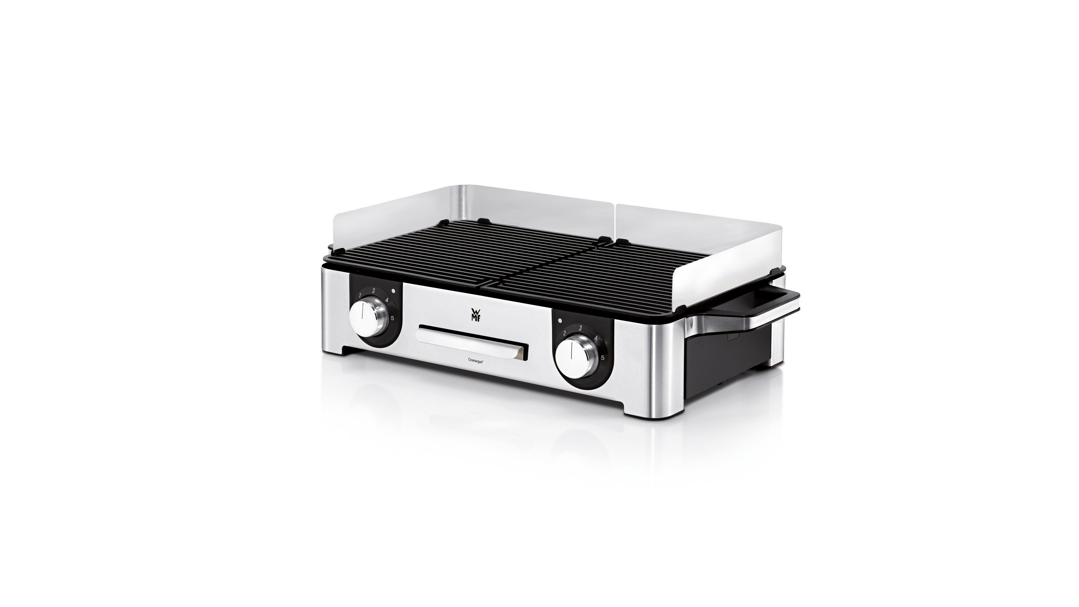 A WMF Lono Master grill a Cromargan® matt rozsdamentes acél egyedi minőségével készül, amely gondoskodik arról, hogy az otthoni és a szabadtéri grillezés egyaránt élmény legyen. A 28 x 50 cm-es grillező lap bőséges teret biztosít különféle grillezett ételek elkészítéséhez. A grill két, önálló hőfokszabályzást lehetővé tevő különálló bordázott grillező lappal van ellátva, LED világítású kezelőgombbal kiegészítve.