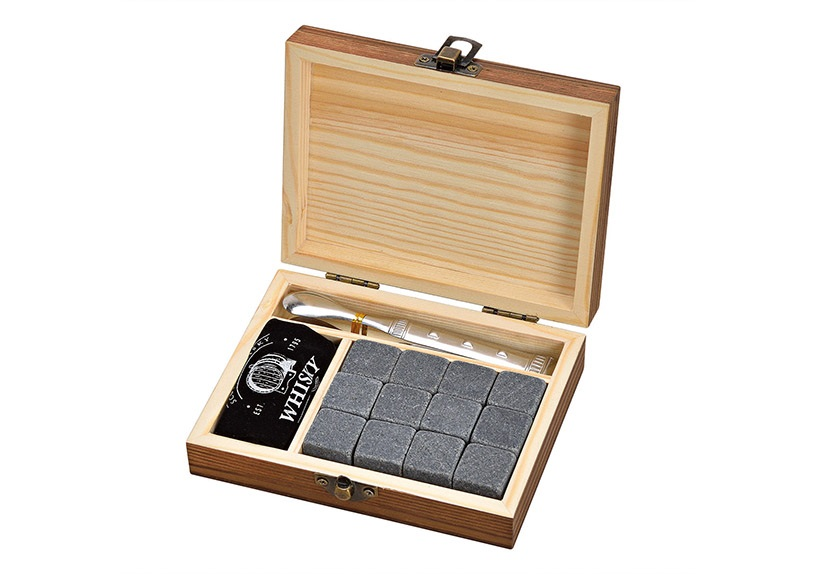 Prémium bazalt whiskykő készlet – Bársonyzacskós, fadobozos kivitel